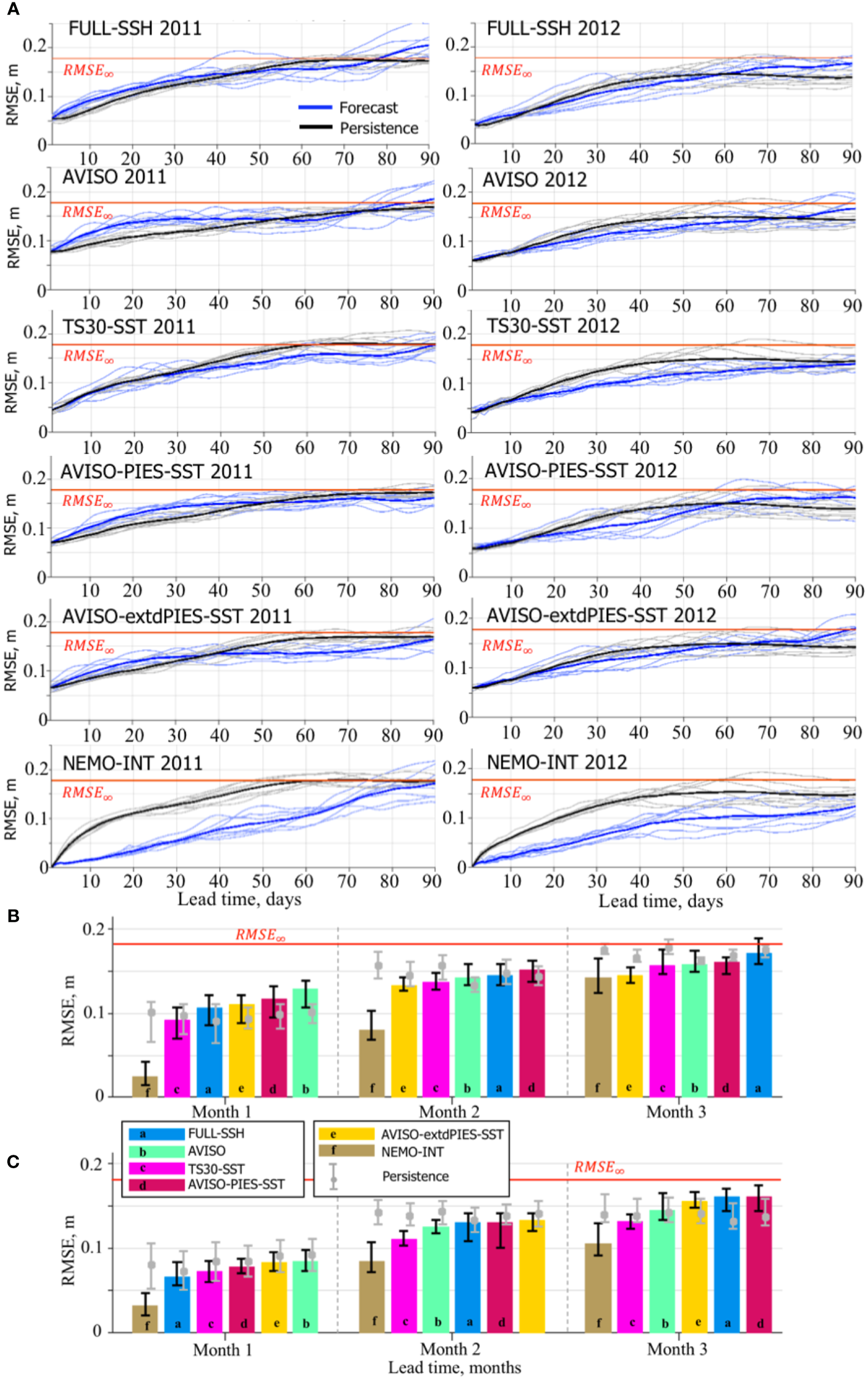 RMSE between SSH from the OSSE forecasts and the NR. (A) Daily RMSE for individual forecasts and persistence from the OSSE forecast groups during 2011 (left column) and 2012 (right column). The bold solid lines are the mean RMSE estimates for the forecasts (blue) and persistence (black). The horizontal red line indicates 95% of the saturation value (RMSE∞ = 0.178 m). The bar diagrams (B, C) show median RMSE (m) of the forecasts by the OSSE forecast groups during months 1 through 3 started in May-June 2011 (B) and January-February 2012 (C). Within each month, the OSSE forecast groups are ordered according to the ranks based on the median RMSE. The vertical black lines on top of the bars indicate the IQR. The grey line and the bullet show the IQR and the median, respectively, of the persistence corresponding to the OSSE forecast group. The horizontal red line indicates RMSE∞.