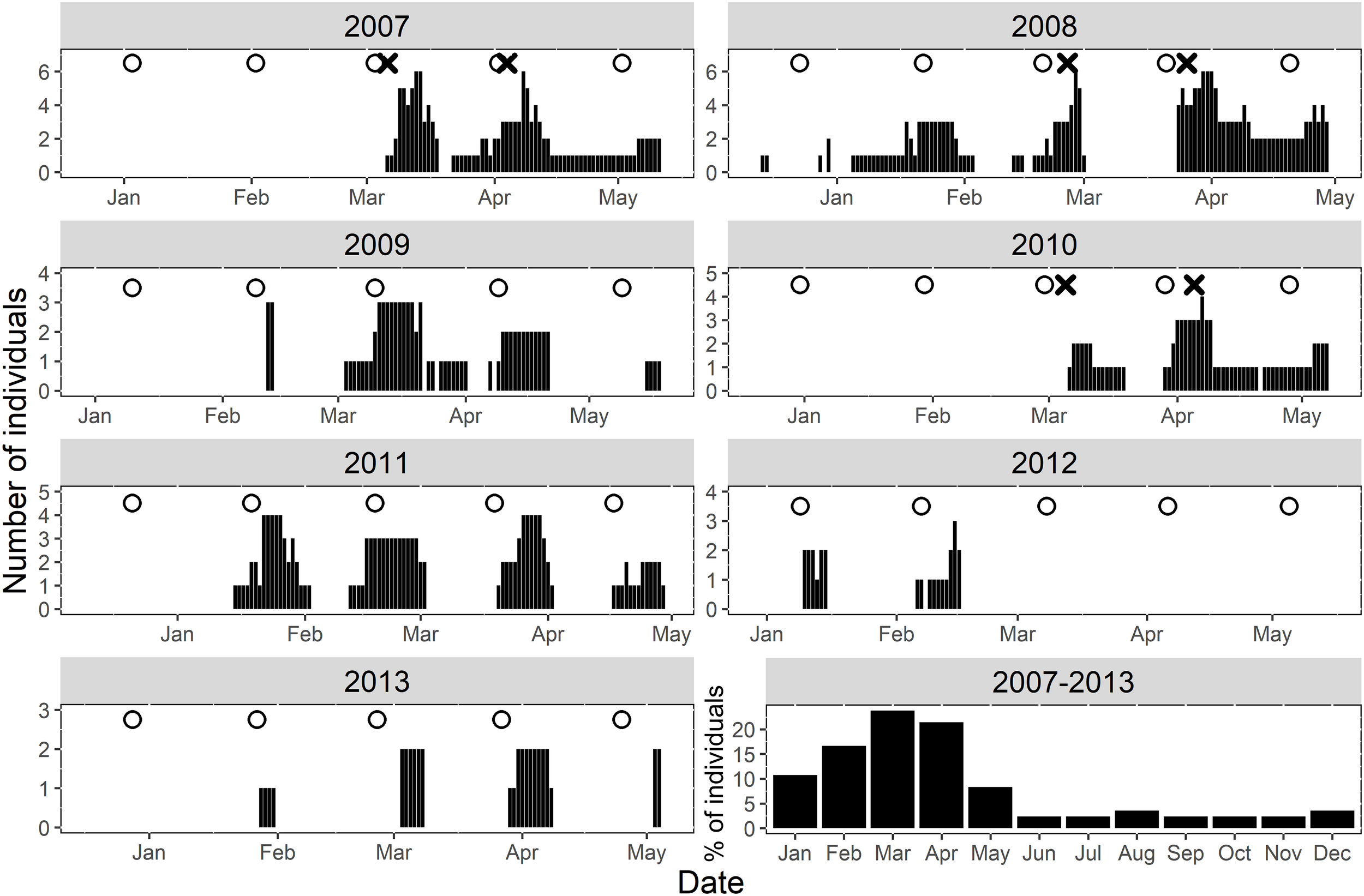 Nine individuals displayed temporary residence within the larger array based on the continued presence of detections at specific locations (temporary residency sites) outside of spawning periods (Table 2). Detections within temporary residency sites were removed from analyses pertaining to spawning migrations and space use around the FSA to ensure they did not bias the interpretation of spawning-related behaviour but were retained for further residency site explorations and summary detection histories. Each temporary residency site was typically at the extreme margin of detection from the FSA site receiver, so detections incorporating movements between resident sites and the FSA site were not affected. However, data from three individuals (IDs 1107-29, 1303-7558, and 1303-57082) were removed from analyses relating to spawning migration behavior because they remained resident near the FSA site receiver and spawning vs non-spawning movements could not be distinguished (Table 2).