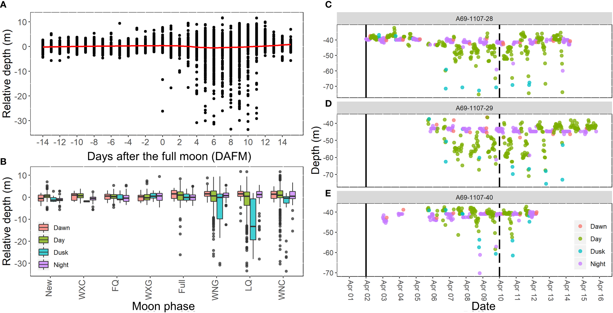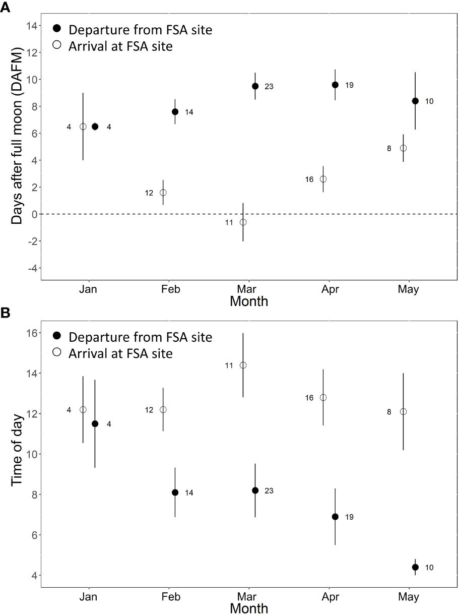 Residency time at the spawning site (station 009) was determined at a daily interval (i.e., minimum of 2 detections day-1 to reduce any effect of false positive detections). Spawning site residency (number of days detected) of female and male Nassau grouper was calculated for each lunar period and compared using analysis of variance (ANOVA). Spawning season residency was calculated as the number of days present divided by the total number of days between the first and last detection during spawning seasons. The date (relative to the full moon) and time of day of arrival/departure at the spawning site were investigated during each spawning period (i.e., five possible arrivals/departures each spawning season). Each new lunar period was considered to begin at the first detection following a minimum of 10 days without any detections to ensure the individual had left the spawning site. Similarly, the last detection during a spawning period ended when no detection occurred for that individual within the following 10 days. This approach was necessary to differentiate between arrivals/departures of individuals that remained near the spawning site throughout the spawning season. Arrivals were not included during the period that an individual was tagged since capture took place within the array area after the fish had ‘arrived’.