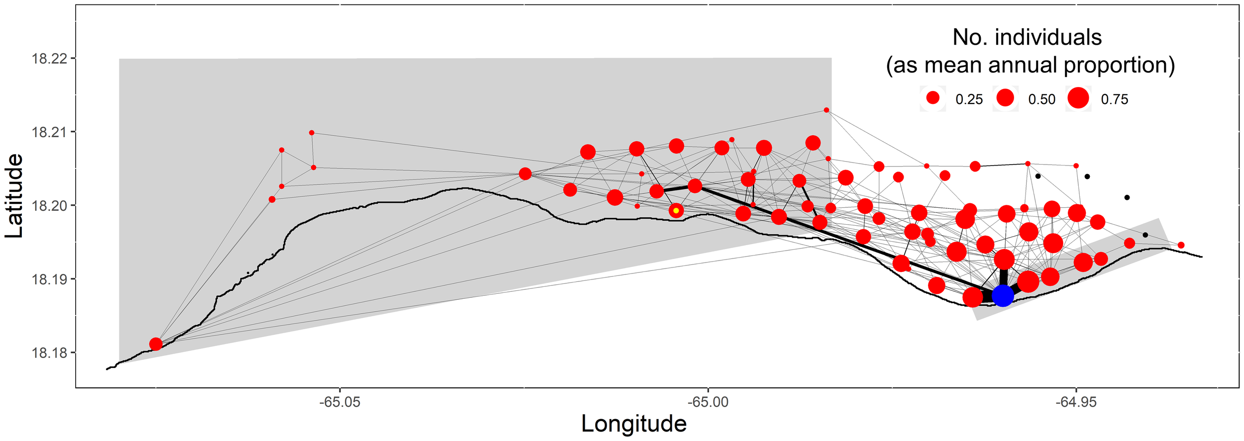 Acoustic telemetry studies have provided unique insights into the movement and migration patterns of Nassau grouper in Belize (Starr et al., 2007), Bahamas (Dahlgren et al., 2016; Stump et al., 2017), Cayman Islands (Semmens et al., 2007; Blincow et al., 2020) and US Virgin Islands (Rowell et al., 2015), but spatially-explicit information that can guide management and conservation efforts at spawning aggregation sites is limited. In the United States Virgin Islands, the 1.5 km2 Grammanik Bank seasonal closed area was established in 2006 to protect a newly discovered Nassau grouper spawning aggregation site (Nemeth et al., 2006). The Grammanik Bank boundaries were determined based on underwater visual surveys of abundance and distribution patterns of Nassau grouper and other aggregating species and implemented with the support of commercial fishers and other community partners (Nemeth et al., 2006). Although early biological assessments showed a positive population response by Nassau grouper (Kadison et al., 2006), we questioned if the size and timing of the seasonal closed area was appropriate to maximize recovery potential of this endangered species. We used acoustic telemetry to provide a more comprehensive analysis of the spatial and temporal movement patterns of Nassau grouper around the Grammanik Bank spawning aggregation site. We show how behavioral patterns of movement can inform the design of biologically–relevant boundaries and timing of seasonal closures but also how our results can be used broadly for marine managed areas whose goals are to protect transient fish spawning aggregations.
