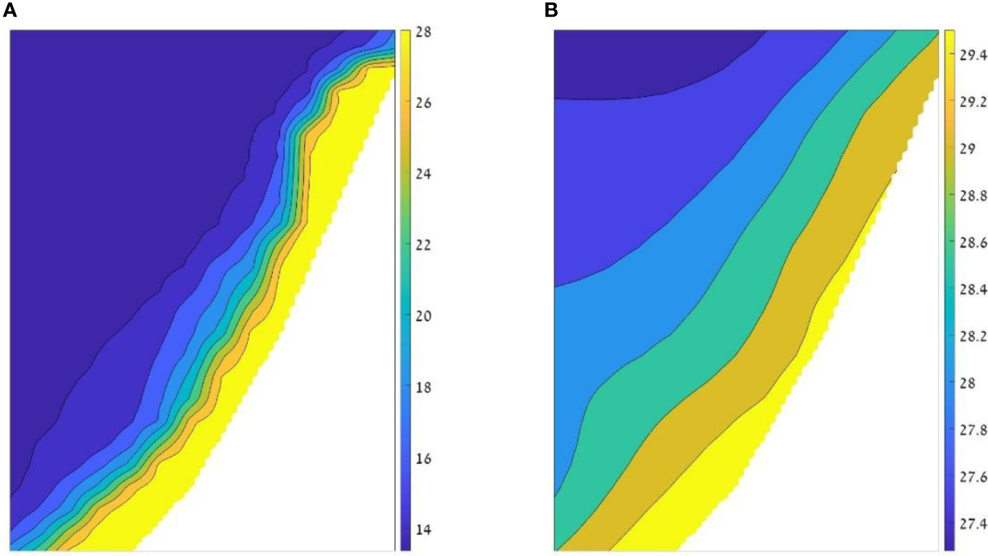 Example of the temperatures input layers for the model. The two layers represent August 2014: (A) temperature layer of the deep layer, adjacent to the bottom with temperatures ranging between 13.3°C (blue) to 29.9 °C (yellow); and (B) temperature layer of the upper 30 m (pelagic zone) in which the values range from 27.2°C to 29.9°C.