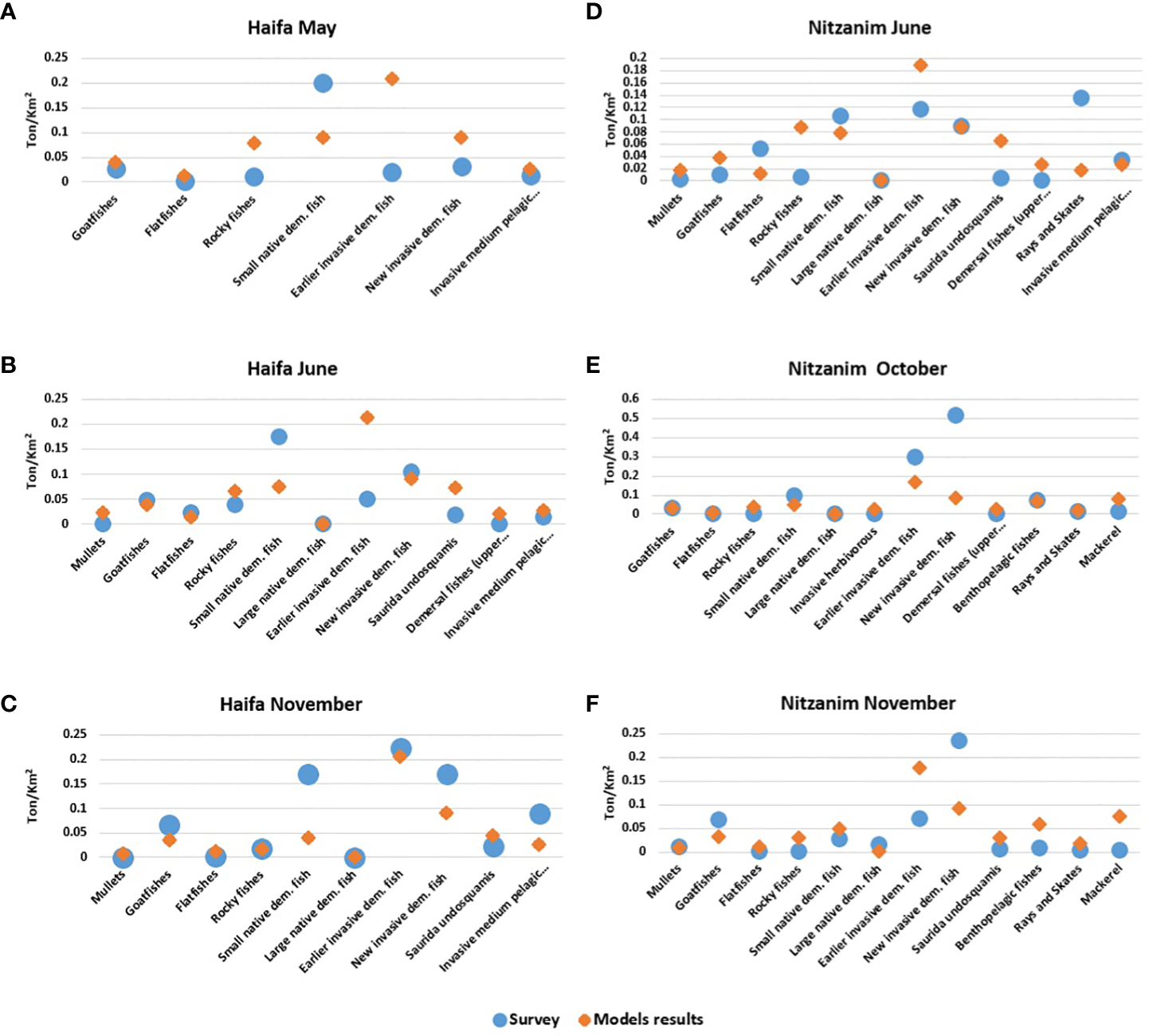 Comparison of model results (orange) and survey results (blue). (A-C) Haifa: May, June, and November; (D-F) Nitzanim: June, October, and November. The numbers represent biomass in t/km2.