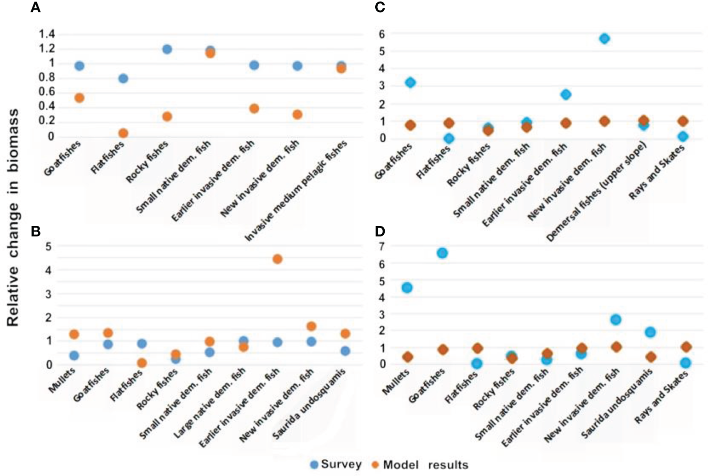 Overall, there was a high correlation between the survey and the model results when examining the seasonal fluctuations. For example, for Haifa, the comparison between November and June shows that eight of the nine functional groups exhibited almost perfect correlation between the model and the survey with correlation values (R) of 94%. Similar results were obtained for seven of the nine groups at Nitzanim for the comparison between November and June (Figure 6). However, analysis of the outlier groups in May and June in Haifa highlighted the differences in the seasonal variation. The range of seasonal variation in the model results reached 20%, while in the survey results the variation in the extreme cases reached 90% (Figure 6A); this difference in range was observed for five groups. In contrast, there was a large degree of similarity between the model and survey results, in the comparison between November and June in Haifa; eight groups had a large degree of similarity (25-88%) between the November and June results, while only one group exhibited a significant difference of 450% of Rocky fishes (Figure 6A). Even in the case of comparing relationship between November and June in Haifa, to the survey results, only one group had difference between seasons of to 600% (Earlier invasive dem. Fish) while the model results had differences of up to only 60% between seasons (Figure 6B). The results for Nitzanim were similar; the comparison between October and June showed a high correlation (average of 75%) in six groups and differences of up to 600% in the survey results for one group, while the model results demonstrated changes of up to 50% (Figure 6C). The comparison between November and June in Nitzanim showed the same trend with a high correlation (average of 80%) in seven groups and a low correlation (25-16%) in two groups also, the survey results varied between seasons by up to 600%, (Figure 6C) while the model results varied seasonally by up to only 70% (Figure 6D).