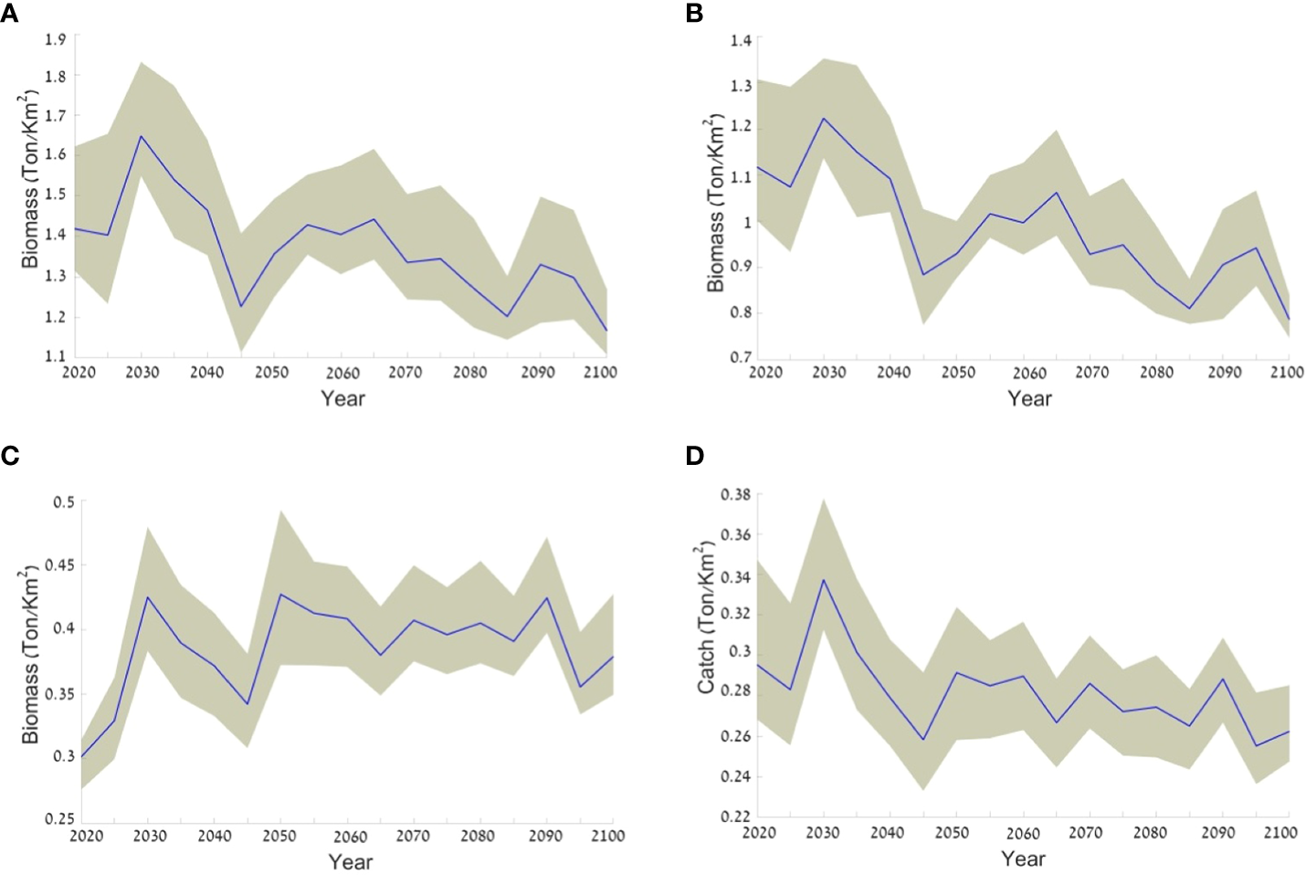 We used a number of indices to examine the scenario results and the effect of climate change and management options on the ecosystem. Some of the indices, such as biomass and catch, and a range of other indices were calculated by the model (Coll and Steenbeek, 2017; Vilas et al., 2020). The indices included general ecological indices that characterize ecosystems, but also specific indices to characterize fishing.