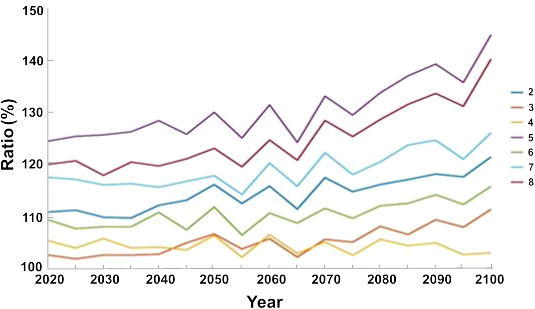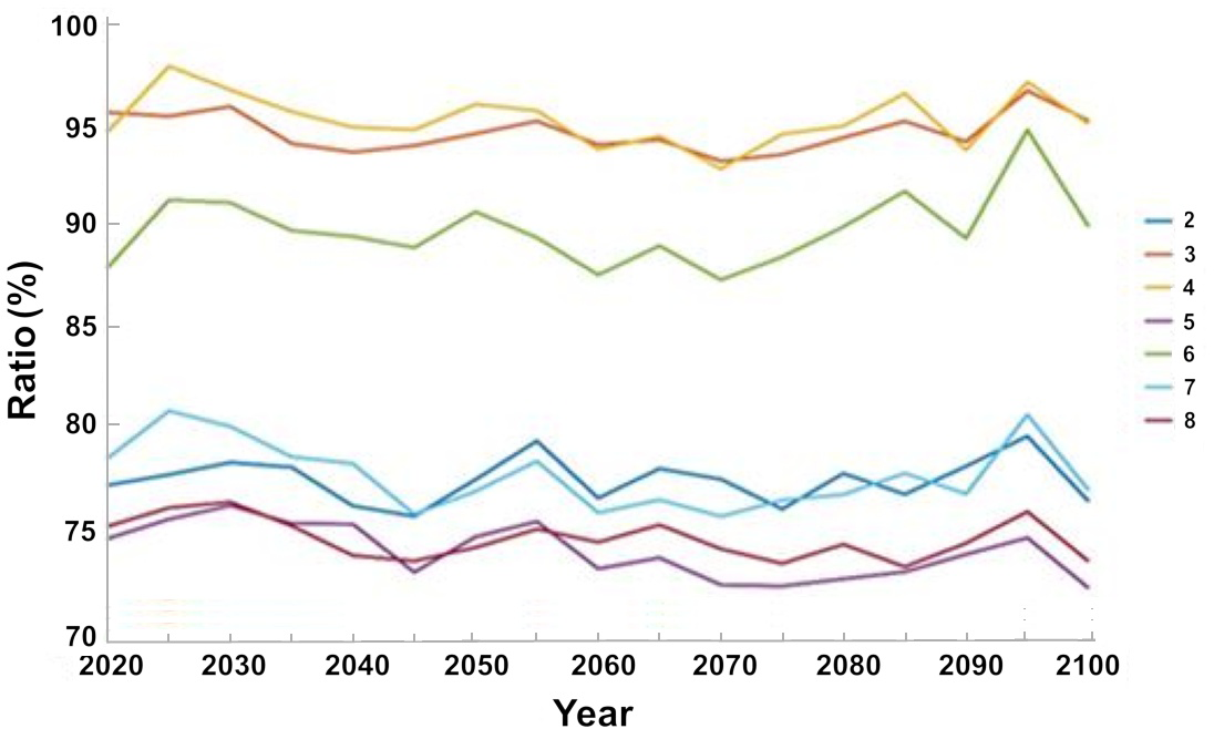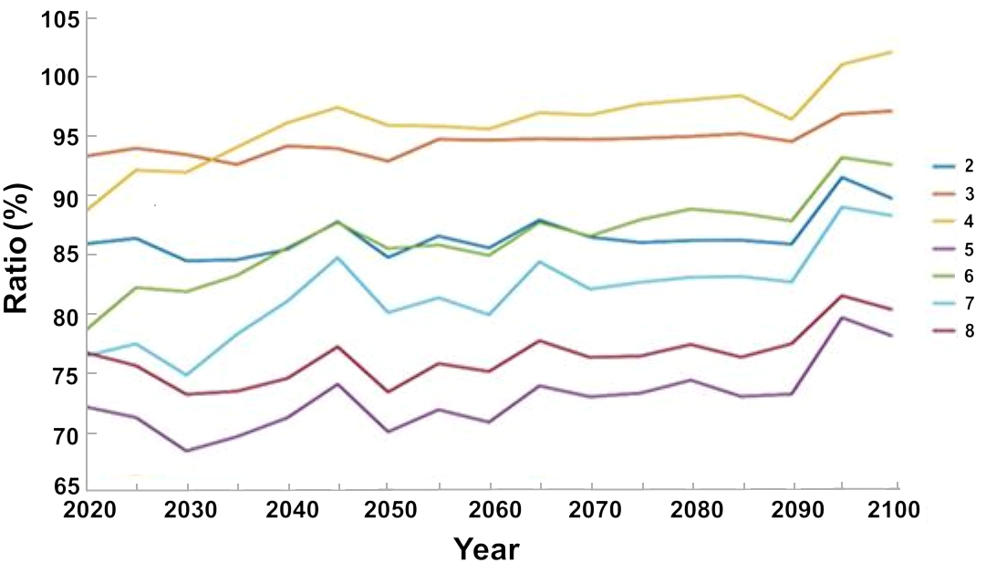 Temporal dynamic comparison (using annual time steps) of the biomass of the broad groups and calculation of the relationship between the scenario results and the base scenario results.