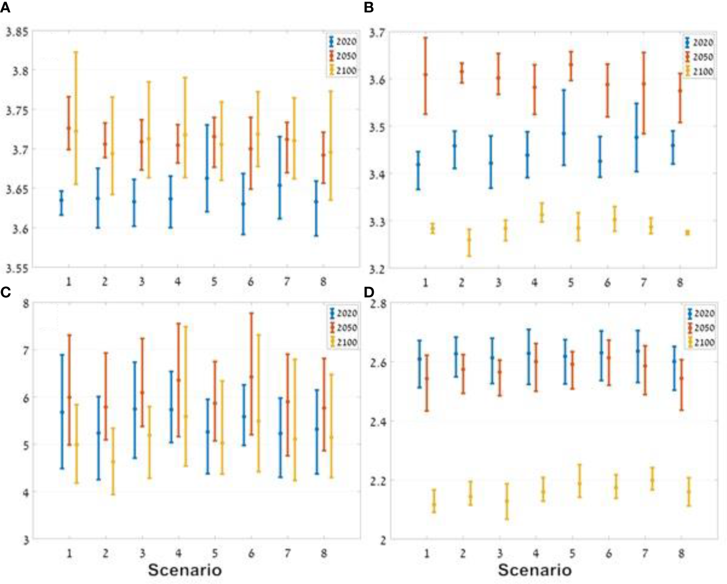 To examine the future consequences of climate change and the various management alternatives we used the output from the Med-CORDEX modelling framework (Ruti et al., 2016) under the RCP8.5 scenario. Med-CORDEX is a unique framework where research communities make use of atmospheric, land surface, river and oceanic models in regional climate system models to increase the reliability of past and future regional climate information and understand the processes that are responsible for Mediterranean climate variability and trends. We obtained predictions of sea water temperature from three different sources. We adapted predicted water temperatures for the model region to create monthly temperature layers for the period 2006–2100 for the upper 30 m and for the layer adjacent to the bottom. The use of three different sources allowed us to introduce uncertainty into the temperature inputs (Figure 4). Outputs from regional Med-CORDEX (MC) models were used to drive the Ecospace model under the RCP8.5 emissions scenario (Soto-Navarro et al., 2020):