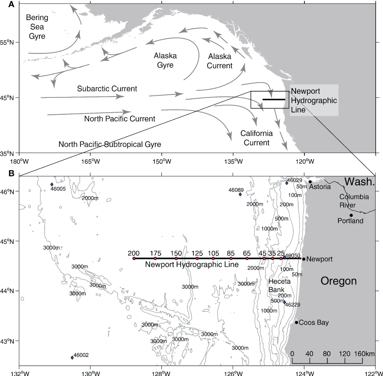 Study region. (A) Schematic map of Northeast Pacific oceanography. (B) Bathymetry along the Newport Hydrographic Line (black line) with individual sampling stations (red dots), and National Buoy Data Center buoys (blue diamonds). Bathymetry data from GEBCO Bathymetric Compilation Group (2021).