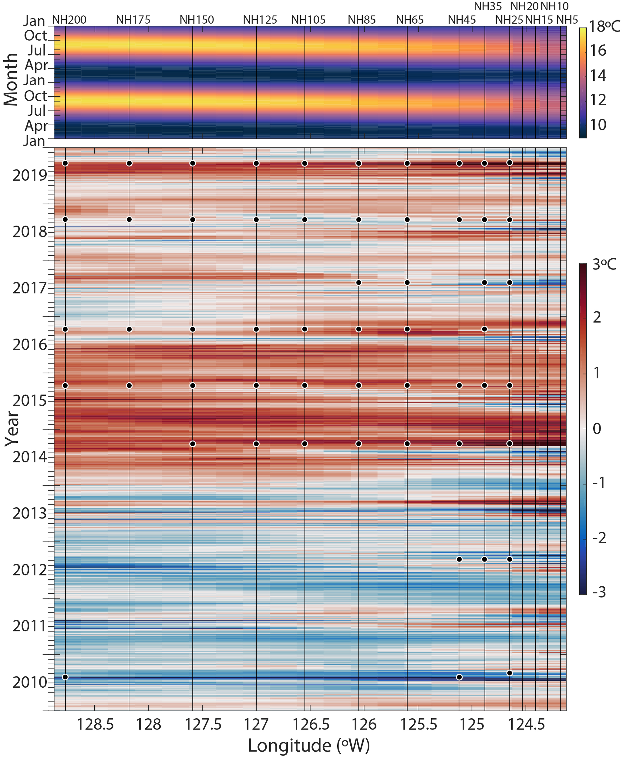 Sea-surface temperature (SST) climatology and Hovmöller plot of SST anomalies along the Newport Hydrographic (NH) Line. The 39-year (1982-2020) seasonal climatology is shown across two years in the upper panel (from OISST, see Methods). In the lower panel, SST anomalies from 2010-2019 are shown relative to the 39-year climatology. Vertical lines show the NH Line stations from NH-5 to NH-200. The date and location of each sample analyzed in this study is indicated with a black circle.