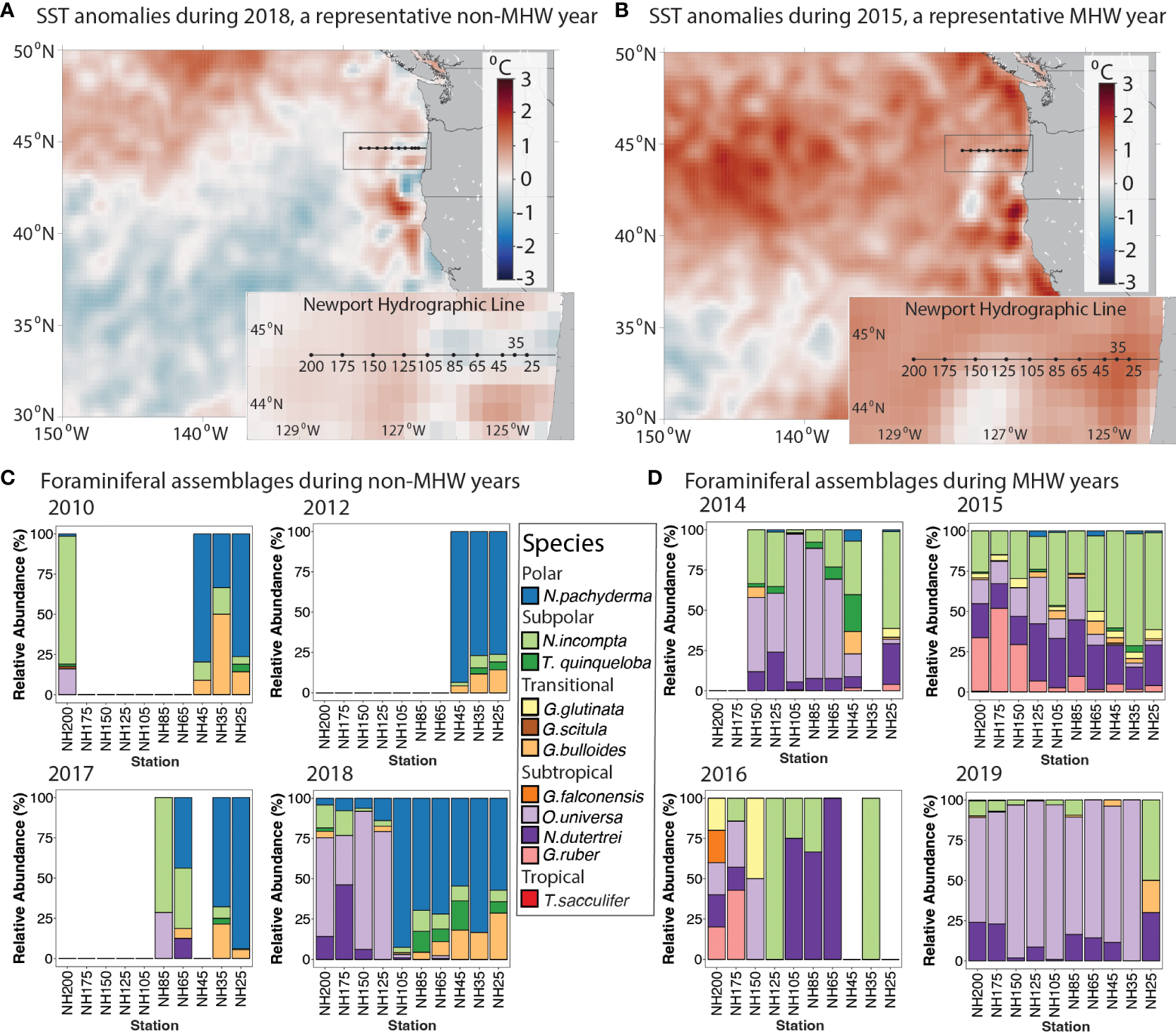 During the MHW years 2014-2016 and 2019, the NH Line experienced anomalously warm SSTs across the entire longitudinal transect (Figure 2). Average 0-100 m temperatures across the transect were higher than in other years, particularly during 2015 and 2016 (~12.9 and 12.8°C; Table 2). Estimated upwelling and primary productivity were reduced (Table 2). During non-MHW years 2010, 2012, 2017, and 2018, SST anomalies were generally negative nearer the coast at the time of sampling, and SST anomalies increased moving offshore along the Newport Hydrographic Line (Figure 2). For example, in 2018, over the month prior to sampling, stations NH25 - NH85 exhibited negative average SST anomalies and stations offshore of NH105 had neutral to slightly positive SST anomalies (Figure 3A). Although the foraminiferal assemblages were highly variable from year to year and station to station, there were robust differences between the MHW and non-MHW years.