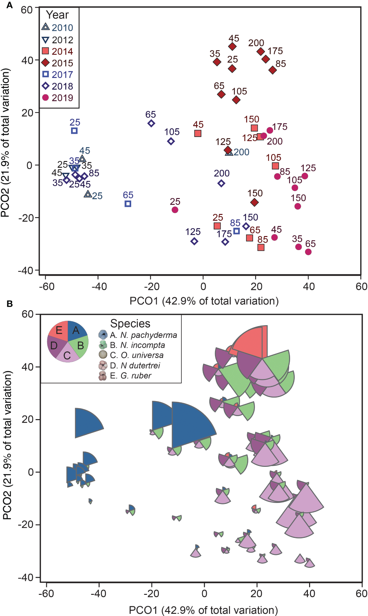 Foraminiferal assemblages highlighting annual and species distribution patterns. The foraminifera abundance data shown in a principal coordinates ordination analysis (PCOA) plot of square-root transformed Bray-Curtis resemblance matrix for all foraminifera abundance data (excluding 2016). The axes in A and B are identical. The upper plot (A) highlights the patterns in different stations and different years, and the lower plot (B) includes patterns in species abundances, with the five most abundant species plotted as bubbles. All slices of the bubbles are scaled from the foraminifera density (0-4 # m-3).