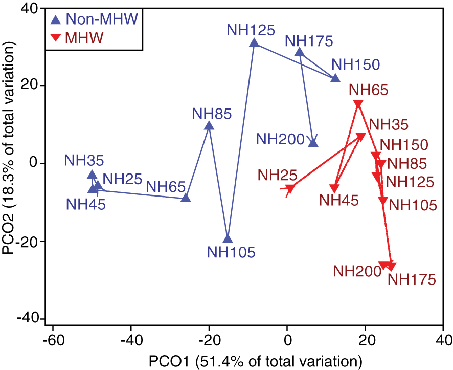 Foraminiferal assemblage patterns along the NH Line transect. A PCOA plot of the distances among centroids for each station. Station centroids are differentiated for years with a MHW (red) and years without a MHW (blue). The overlaid trajectory shows increasing distance offshore from NH25 increasing to NH200.