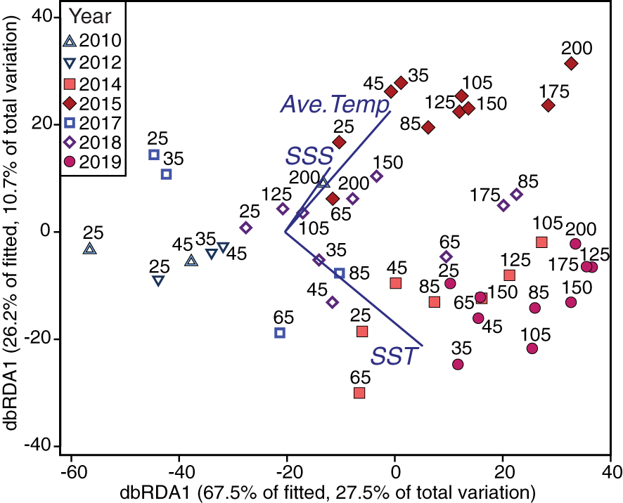 Constrained ordination predicting foraminiferal assemblages from significantly related environmental variables. Foraminifera abundance data plotted as predicted by the environmental data, using redundancy analysis (dbRDA) of dissimilarities calculated on a Bray-Curtis resemblance matrix using square-root transformed foraminifera abundances. Labels indicate NH Line station and colors/symbols indicate different years. The dbRDA model explains 38.2% of the total variation of the foraminifera data. The significant environmental variables, sea surface temperature (SST), sea surface salinity (SSS), and average temperature over the upper 100-m (Ave. Temp), are plotted as vectors with their direction signifying the direction of forcing on the ordination. Best model fit and significant variables were identified using distance-based linear modelling (DistLM).