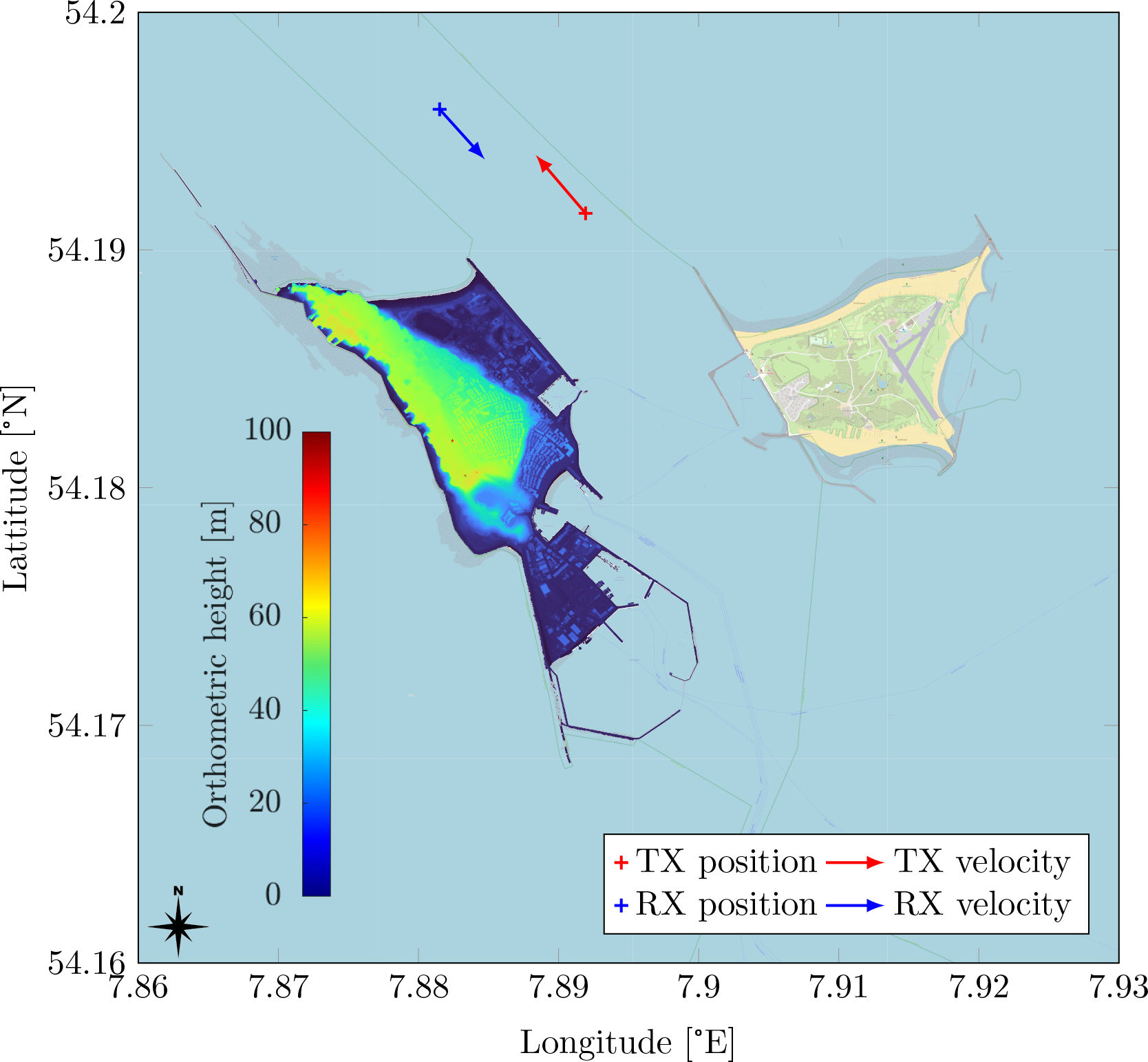 Positions of transmitter (TX) and receiver (RX) north of the Heligoland main island for the measurement scenario introduced in this paper. The TX is located at PTX = (N54.191 542°, E7.891 928°) with speed υTX = 5.7 m/s and Course Over Ground (COG) 320°. The RX is located at PRX = (N54.195 920°, E7.881 509°) with speed υRX = 5.4 m/s and COG 138°. The orthographic height (height above mean sea level) of the Heligoland main island terrain is shown as a color plot.
