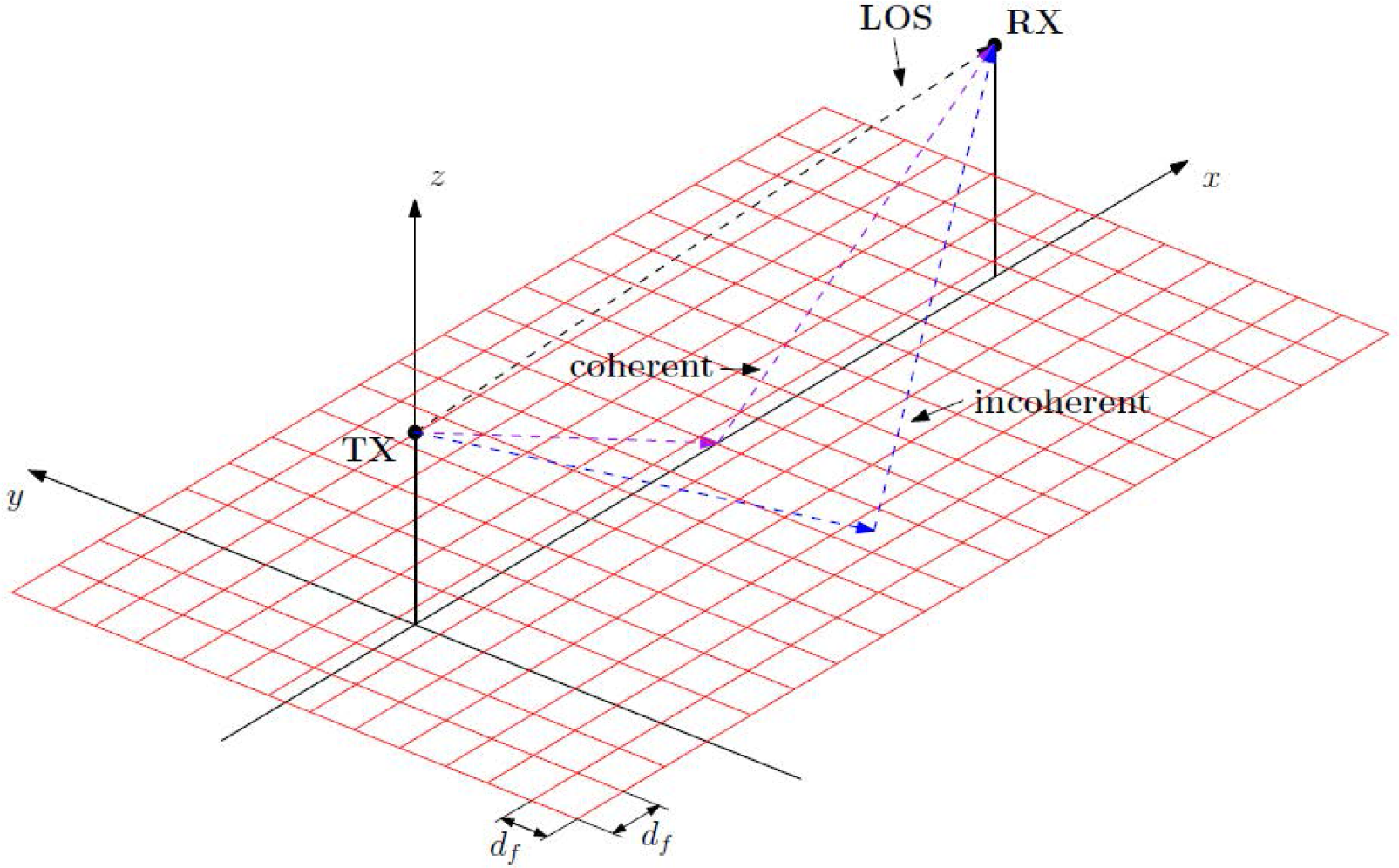 where dLoS is the distance between the transmitter and receiver. dT,coh and dR,coh are the distances from the specular reflection point to TX and RX, respectively. Due to the fact that the equations above represent received powers without phase information we will pass to the electric field representation for each component, which enables us to coherently add up the field components to get a resulting field at the receiver. The electric fields of the LoS, and the coherent and incoherent components at the receiver can be written as
