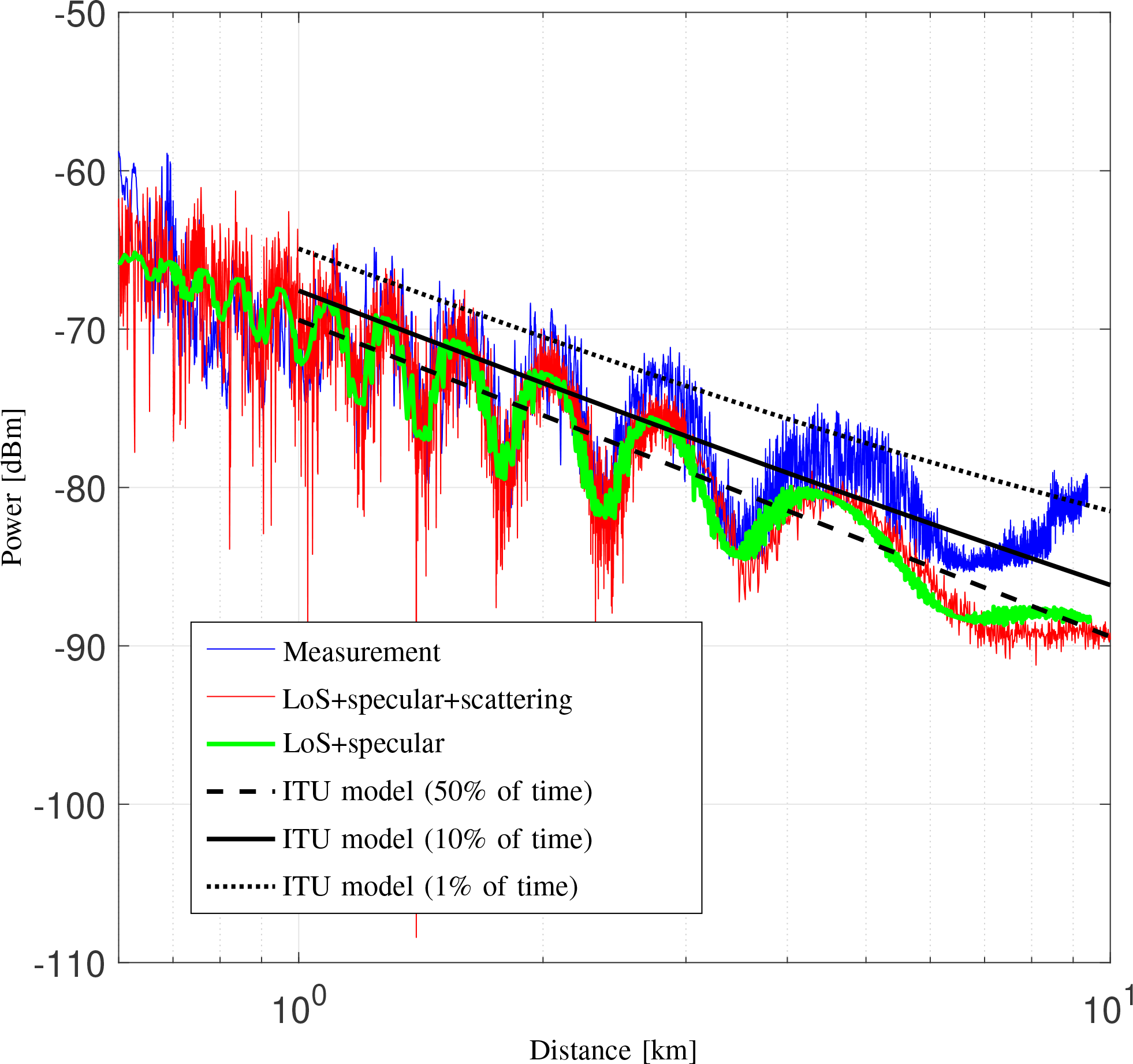 Reflection points on the open sea are from the sea surface or other vessels. The sea surface reflection depends on the roughness of the sea state. A flat sea causes a nearly perfect reflection and results in deterministic two-ray propagation. If the sea state is rougher, a significant portion of the reflected signal energy is scattered in various directions and is not received (Wang et al., 2015). Figure 5 displays the three different components: 1) LoS, 2) specular from the flat sea surface, and 3) scattering from rough sea conditions. Therefore, the superposed sea-surface reflected or specular path is significantly weakened, and the LoS component dominates. The measurements described by Wang et al. (2015) were compared to the propagation model ITU-R P.1546 (Union, 2019). For larger distances, the gap between the measurement data and the different models increases due to the increasing influence of the quantization noise of the measurement device.