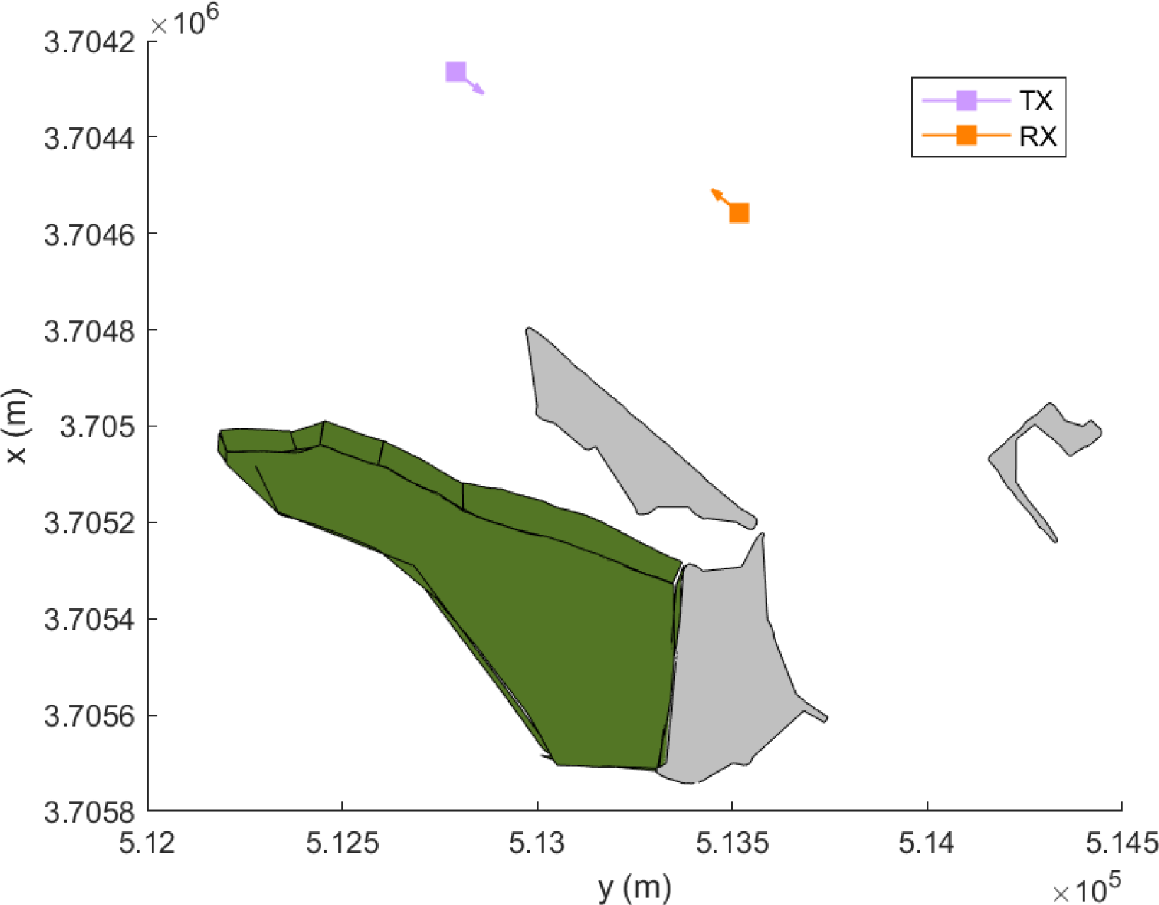 The model used to recreate the Heligoland archipelago and to estimate the land scattering. The mountain of the main Heligoland island is modeled using 13 finite planes (green), whereas the elevated buildings and constructions of both islands are simply modeled with three finite planes (gray). The TX (transmitter) and RX (receiver) represent the ships in the sea.