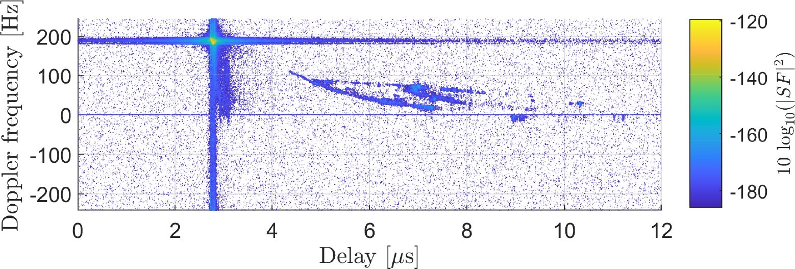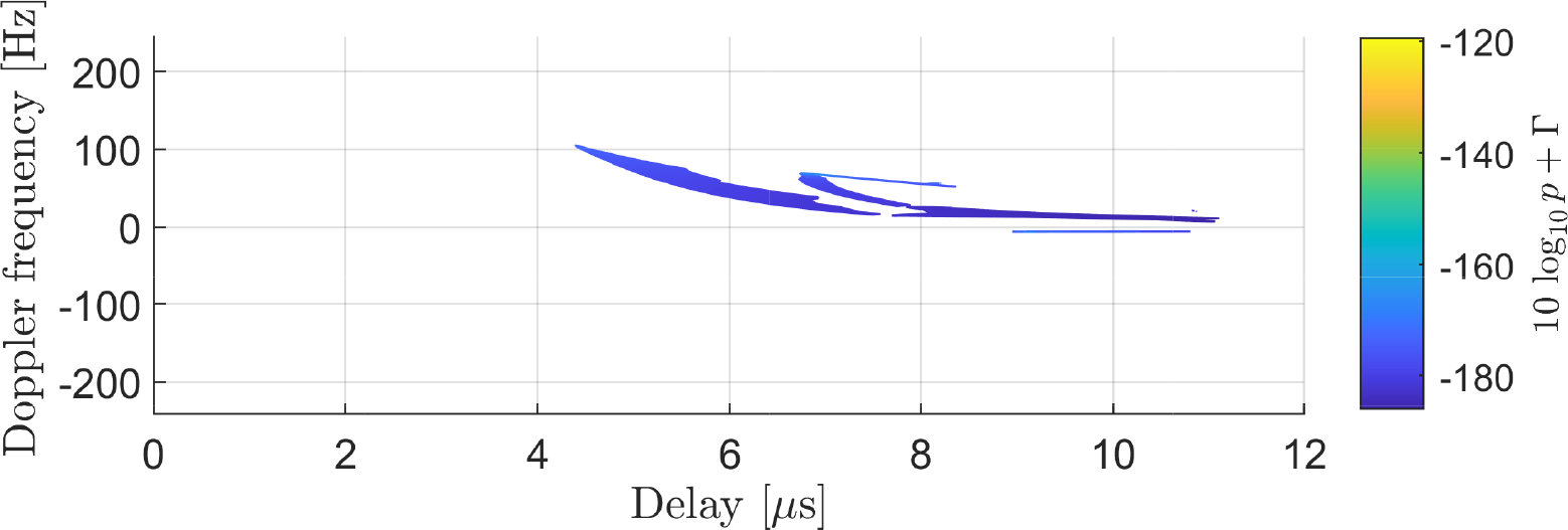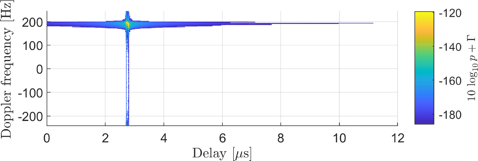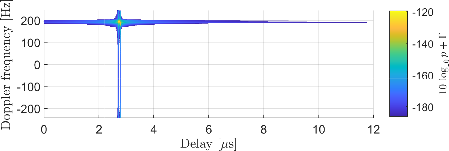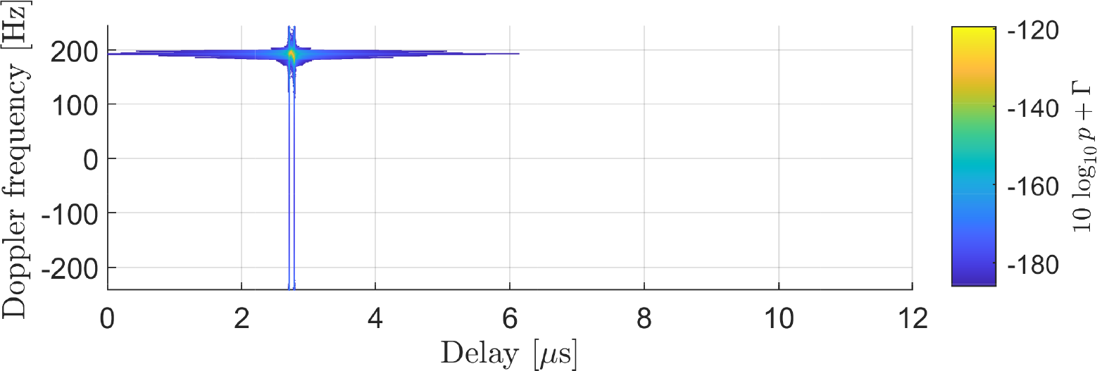 In the channel measurements, however, the LoS component is not shown as ideally expected as a discrete point in the delay Doppler domain. However, it is depicted as two multiplying sinc functions centered at τLoS and fd,LoS and spanning both delay and Doppler directions. As shown in Bellido-Manganell and Walter (2022, Appendix 1), this is caused by the time- and bandwidth-limited sampling of the channel and can be recreated easily using Bellido-Manganell and Walter (2022, Equation (18)).