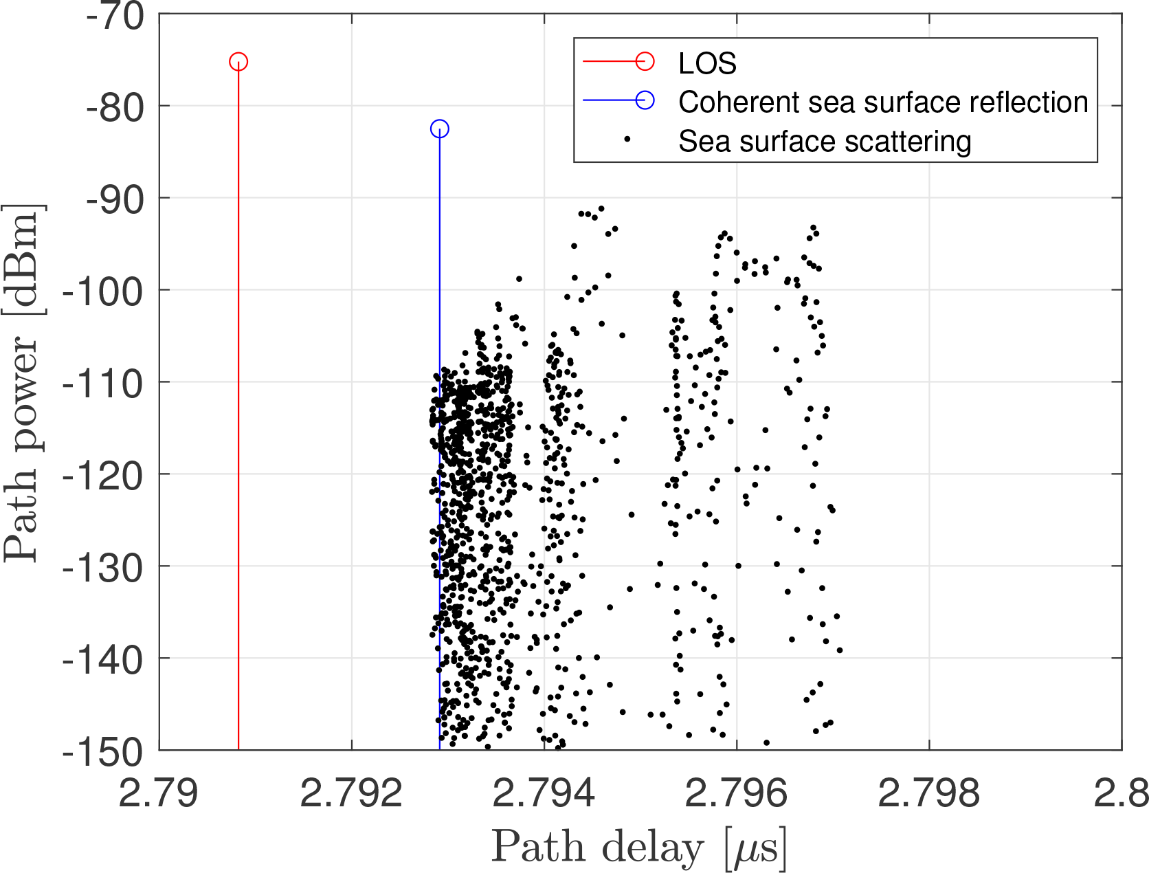 Wireless signal propagation in a maritime environment is significantly influenced by several factors. Apart from the direct propagation (i.e., LoS path) between the transmitter and receiver, there are several types of multipath components occurring due to reflection (referred to as specular component) and diffuse scattering (referred to as incoherent component) from the rough sea surface. Figure 13 is a plot of the three individual components, such as LoS, coherent sea surface reflection, and sea surface scattering, in terms of their contribution in power and delay.