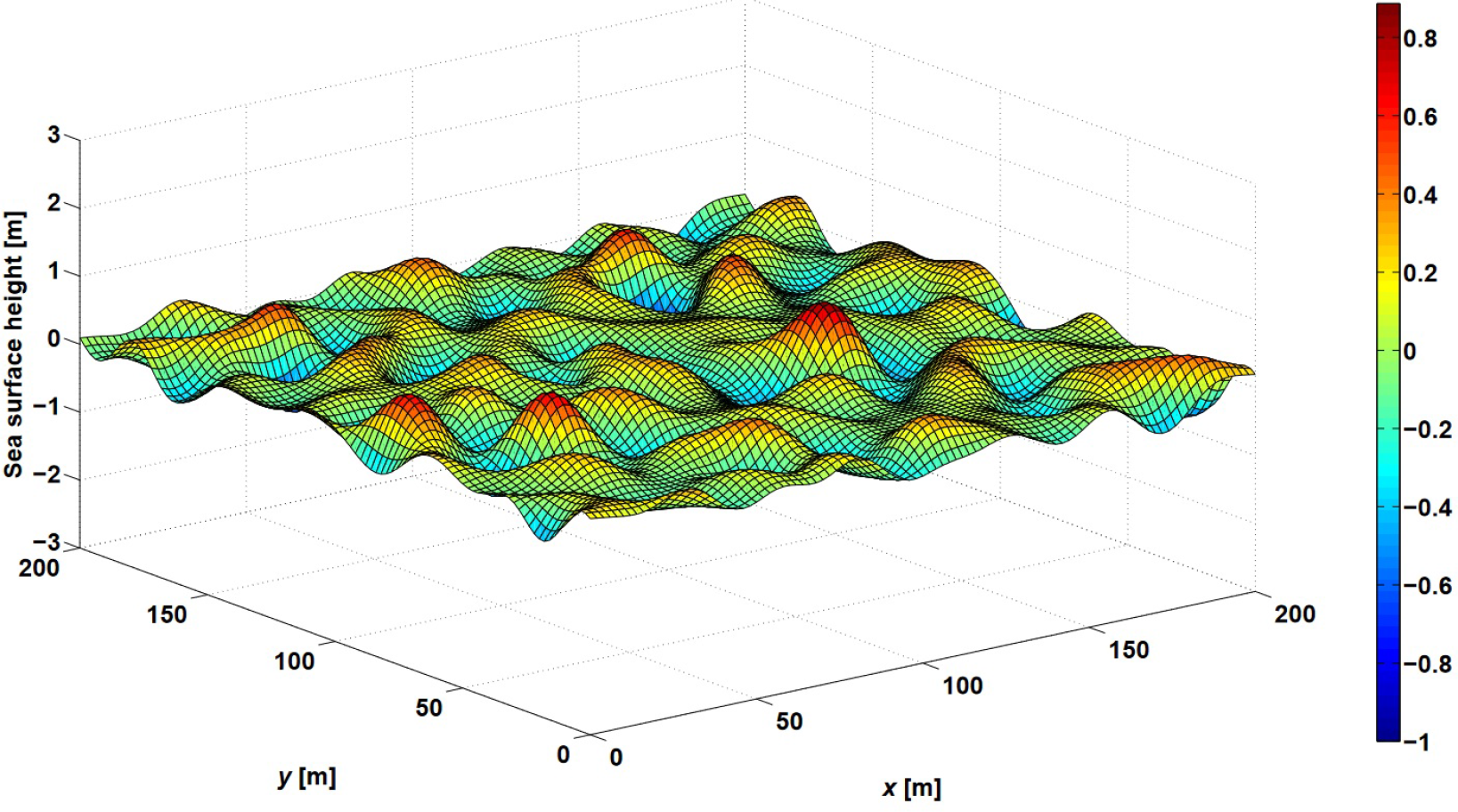 For the calculation of the incoherent sea surface scattering multipath components, we require an exemplary sea surface. For modeling such a sea surface, we build on an approach introduced by Hauser et al. (2001), where the authors define a random two-dimensional slope spectrum in the spatial frequency domain and obtain the corresponding surface slope by a two-dimensional inverse Fourier transform. In contrast to Hauser et al. (2001), we require realizations of the sea surface itself, rather than the surface slope, and continuous evolution of these realizations in time.