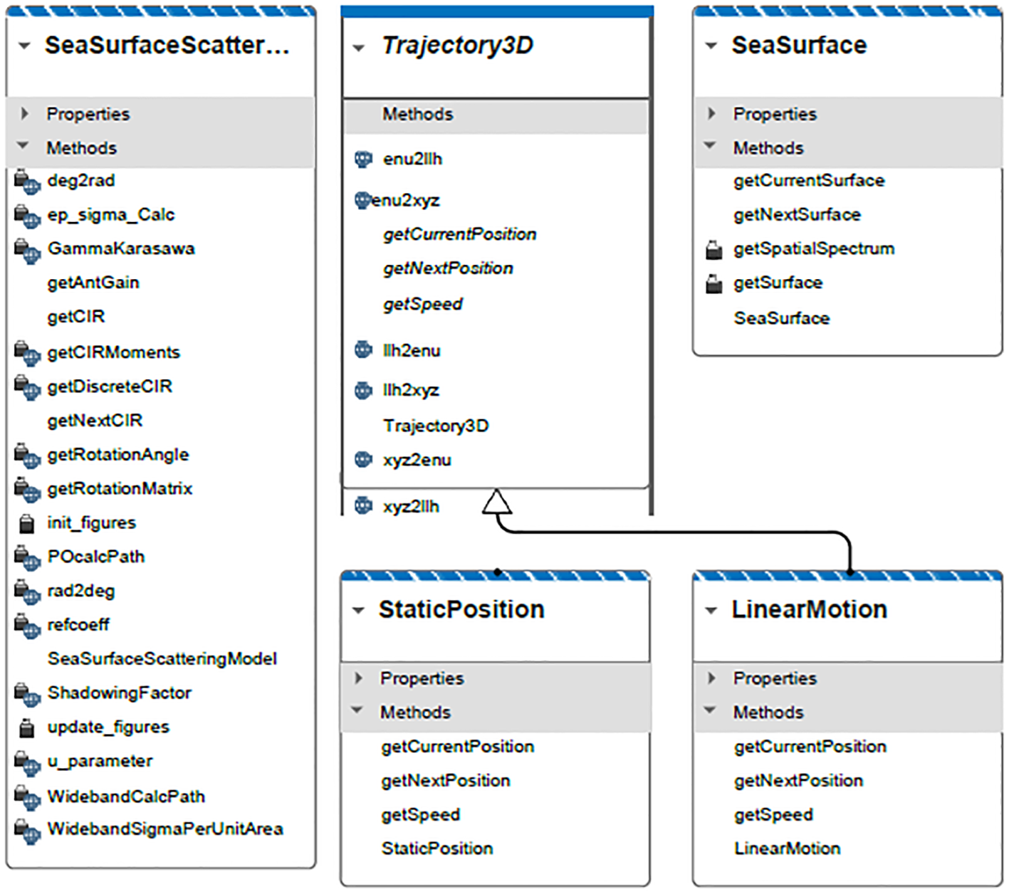 Figure 17 shows the class diagram of the unified modeling language based on three classes representing the sea surface scattering with additional two classes, which represent the motion of the ship. The channel model representing sea surface scattering is implemented by three Matlab classes, which are