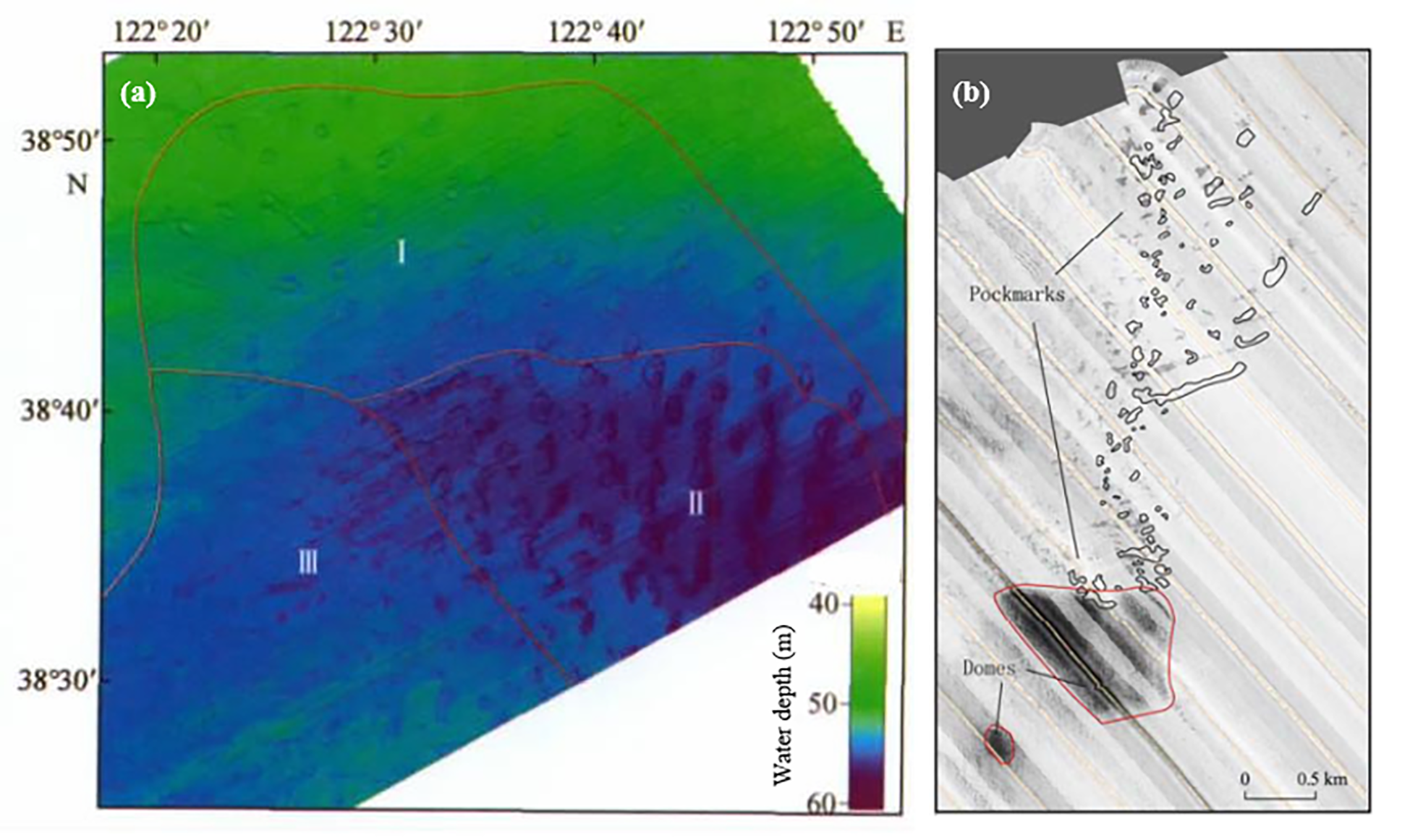 Certain geological features on the fluid escape structures in the Yellow Sea. (A) Bathymetric map showing the micro-ring depression in the north Yellow Sea (Liu et al., 2013). I) Circular or elliptical micro depressing with a protrusion in the center; II) Elliptical micro depression with depression in the center; III) Curved micro depression. (B) Side-scan sonar mosaic image demonstrating domes and pockmarks (Zhao et al., 2009).