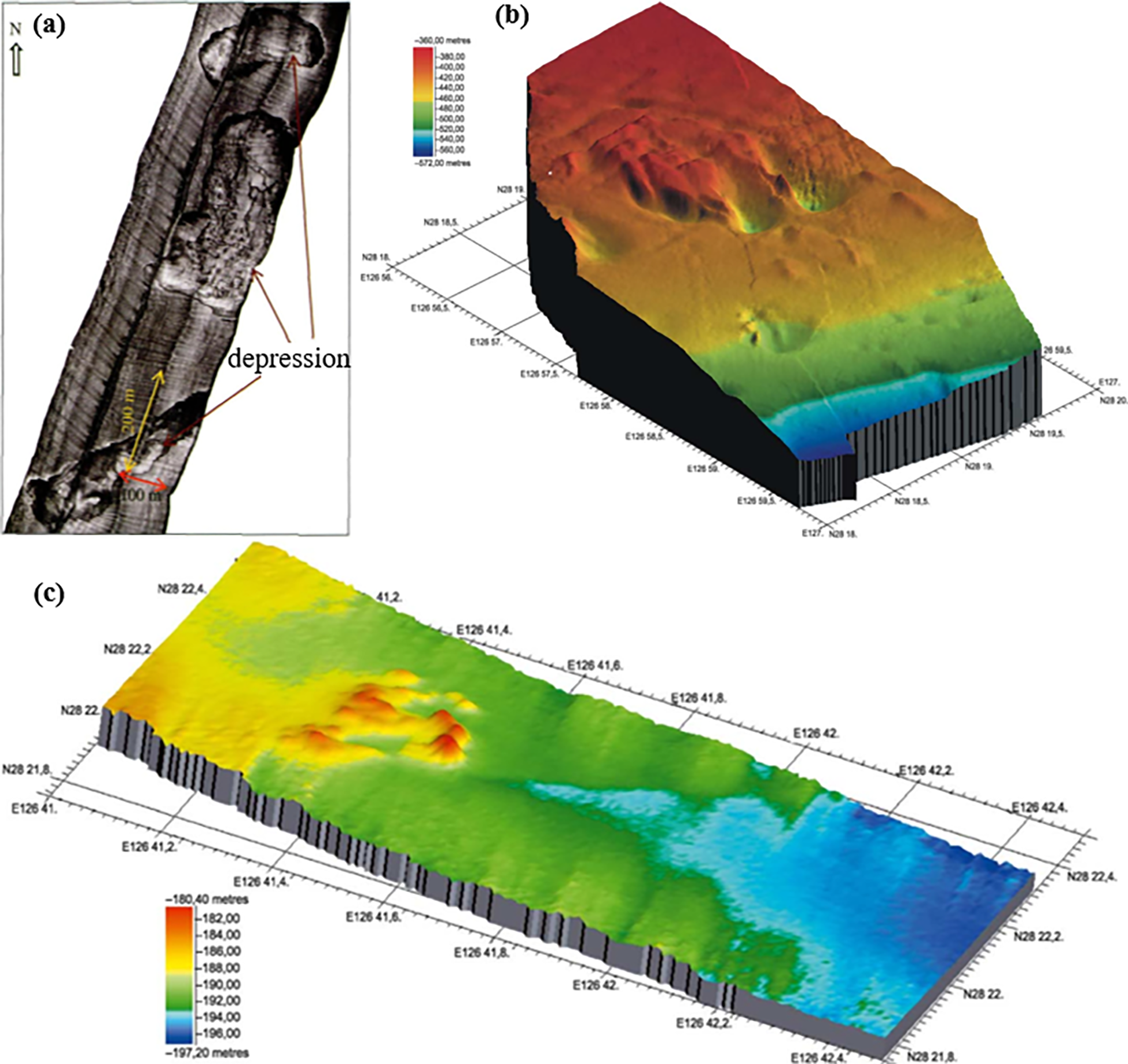 Certain geological features on fluid escape structures in the East China Sea. (A) Side-scan sonar mosaic image showing the depressions in the Zhoushan area, east of East China Sea (Hou et al., 2015). (B, C) Bathymetric map showing sediment depressions and mounds (Yin et al., 2003).