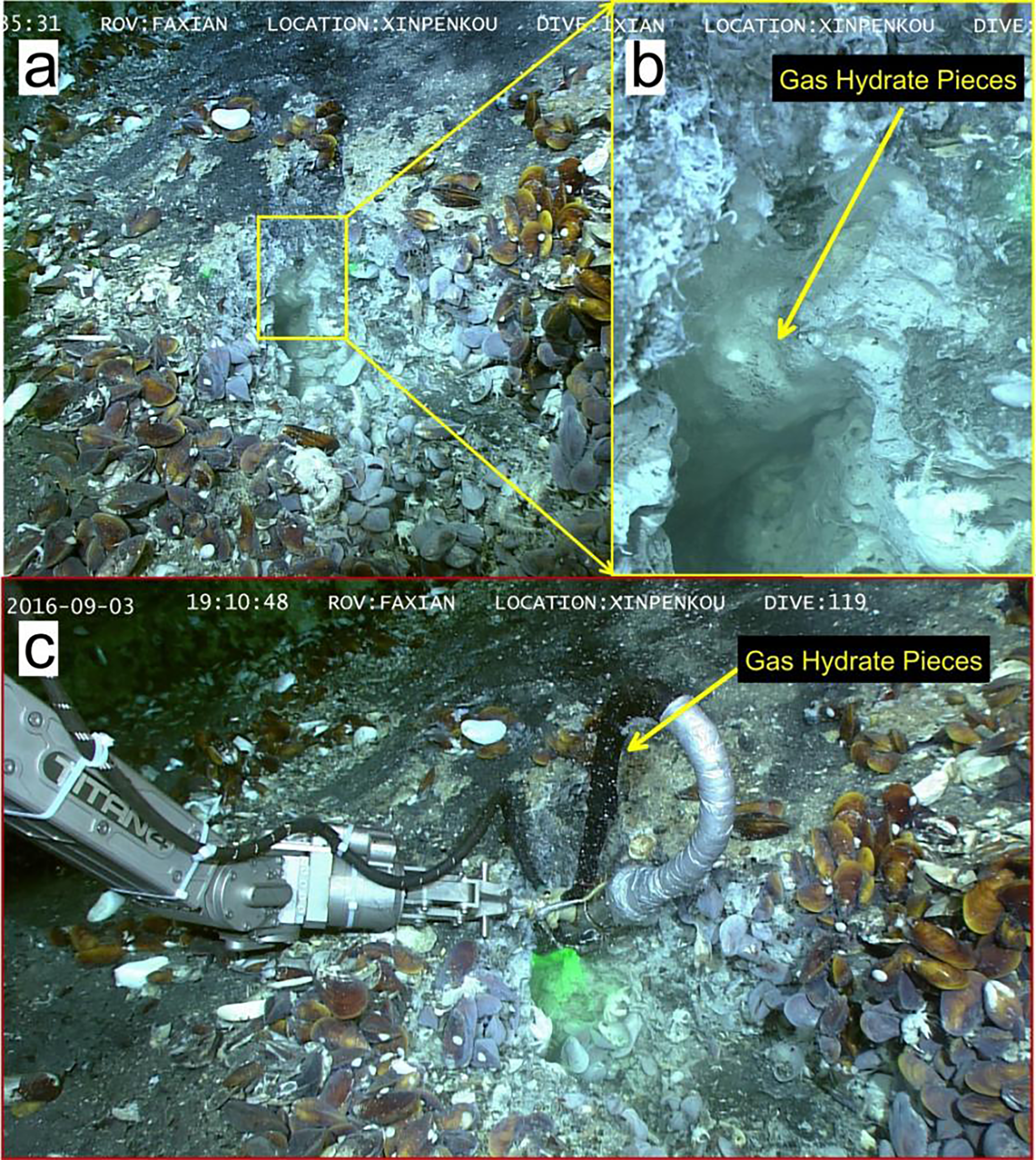 Raman observations of gas hydrates exposed on the seafloor. (A) The exposed hydrate inside the channel of a cold seep vent surrounded by lush chemosynthetic communities. (B) A close-up view of the exposed hydrate attached to the inner wall of the channel. (C) The release of small pieces of gas hydrate from the vent (Zhang et al., 2017).