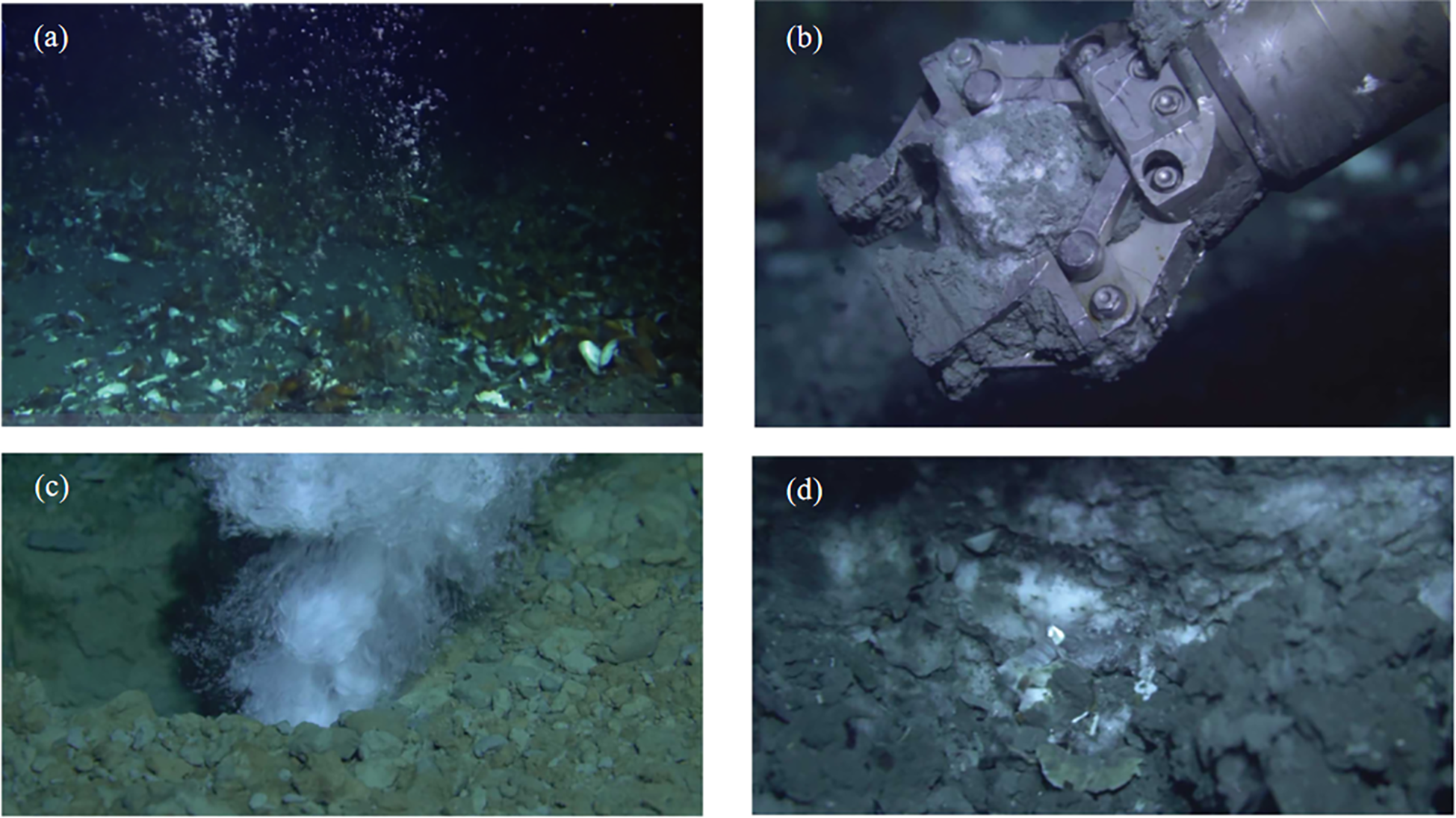 Seafloor observations of gas seepages (A, C) and near-surface gas hydrates (B, D) (Geng et al., 2021).
