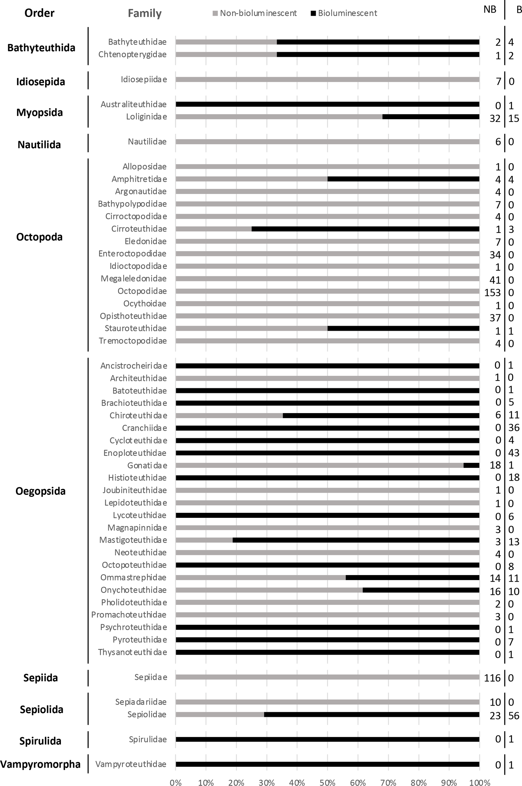 Percentage of known non-bioluminescent (grey) and bioluminescent (black) cephalopod species, globally and according to the cephalopod order. The number of non-bioluminescent (NB) and bioluminescent (B) species is detailed on the right of the figure.