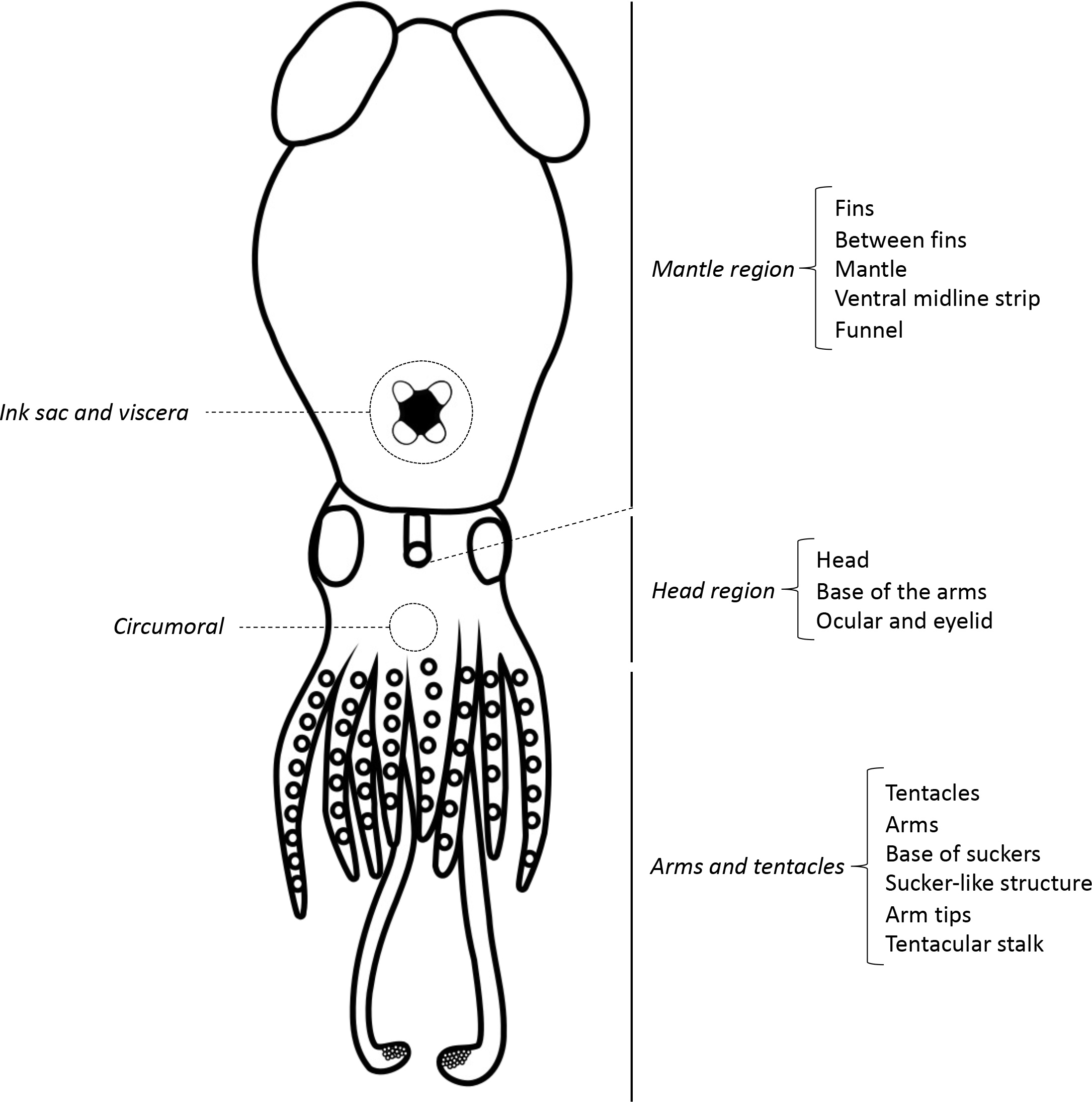 To compare the diversity of bioluminescence among cephalopods, we assign photogenic tissue and secretions into six simplified categories: i) release of bioluminescent material to the surrounding environment; ii) strictly internal photophores that are associated with the ink sac or viscera; iii) circumoral photophores (around the mouth); iv) photophores on the arms and tentacles (comprising photophores on the arms and tentacles themselves, on the arm tips and tentacular stalks, at the base of the suckers and photophores with a sucker-like structure); v) photophores on the head region (combining the photophores on the head integument up to the base of the arms and internal photophores associated with the eyes and eyelids) and vi) photophores on the mantle region, comprising photophores both on the surface and embedded in the mantle, between and on the fins, as a strip along the ventral midline and/or on the funnel (Figure 4). In this comparison, we do not distinguish between bacteriogenic and autogenic photophores. We note that our grouping of photophores on the head integument with internal photophores associated with the eyes differs from previous reviews (Berry, 1920b; Herring, 1988), because they are thought to have mostly a similar role in counterillumination (Herring, 1988).