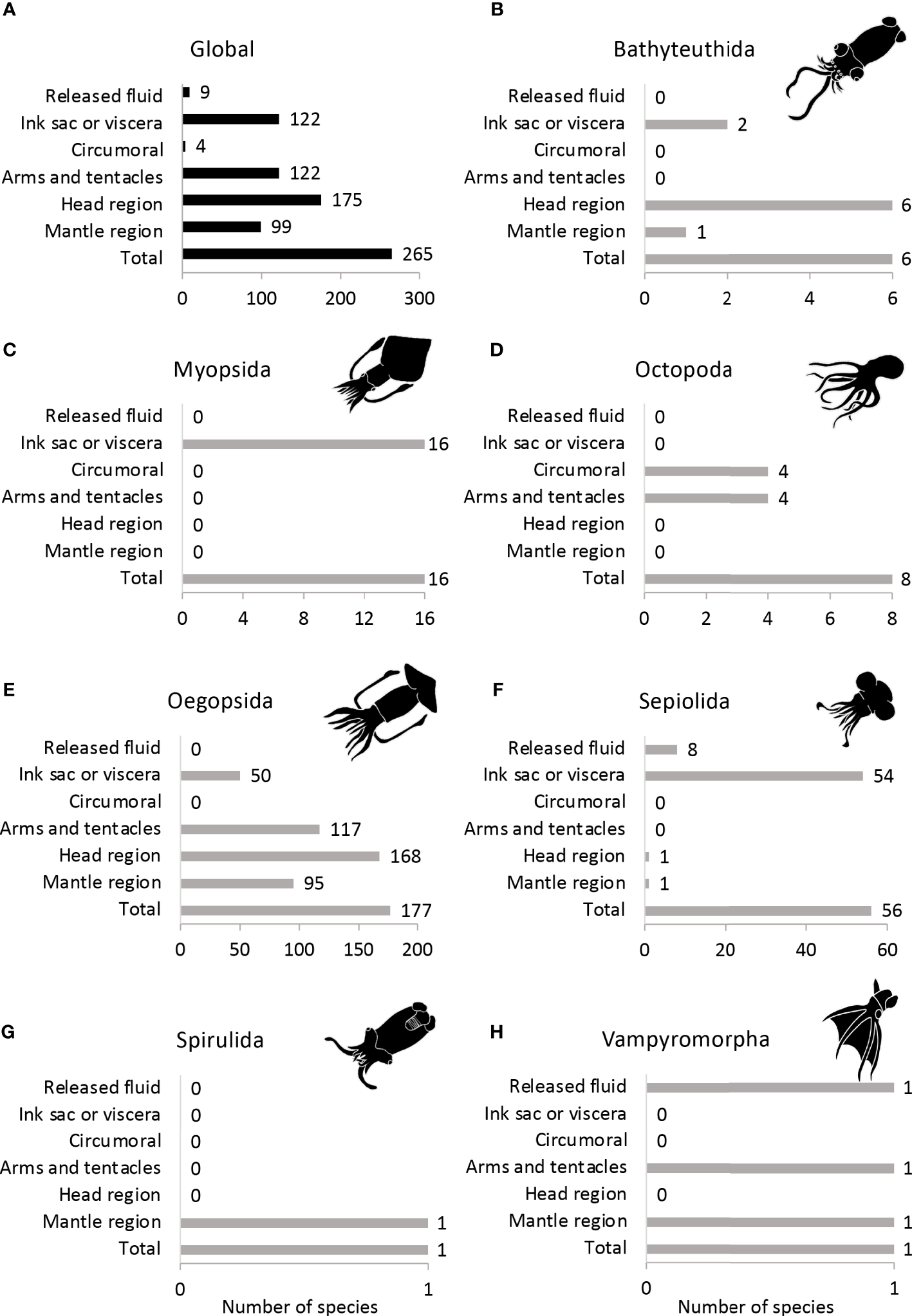 Morphological distribution of photophores in (A) all cephalopods, (B) Bathyteuthida, (C) Myopsida, (D) Octopoda, (E) Oegopsida, (F) Sepiolida, (G) Spirulida and (H) Vampyromorpha.