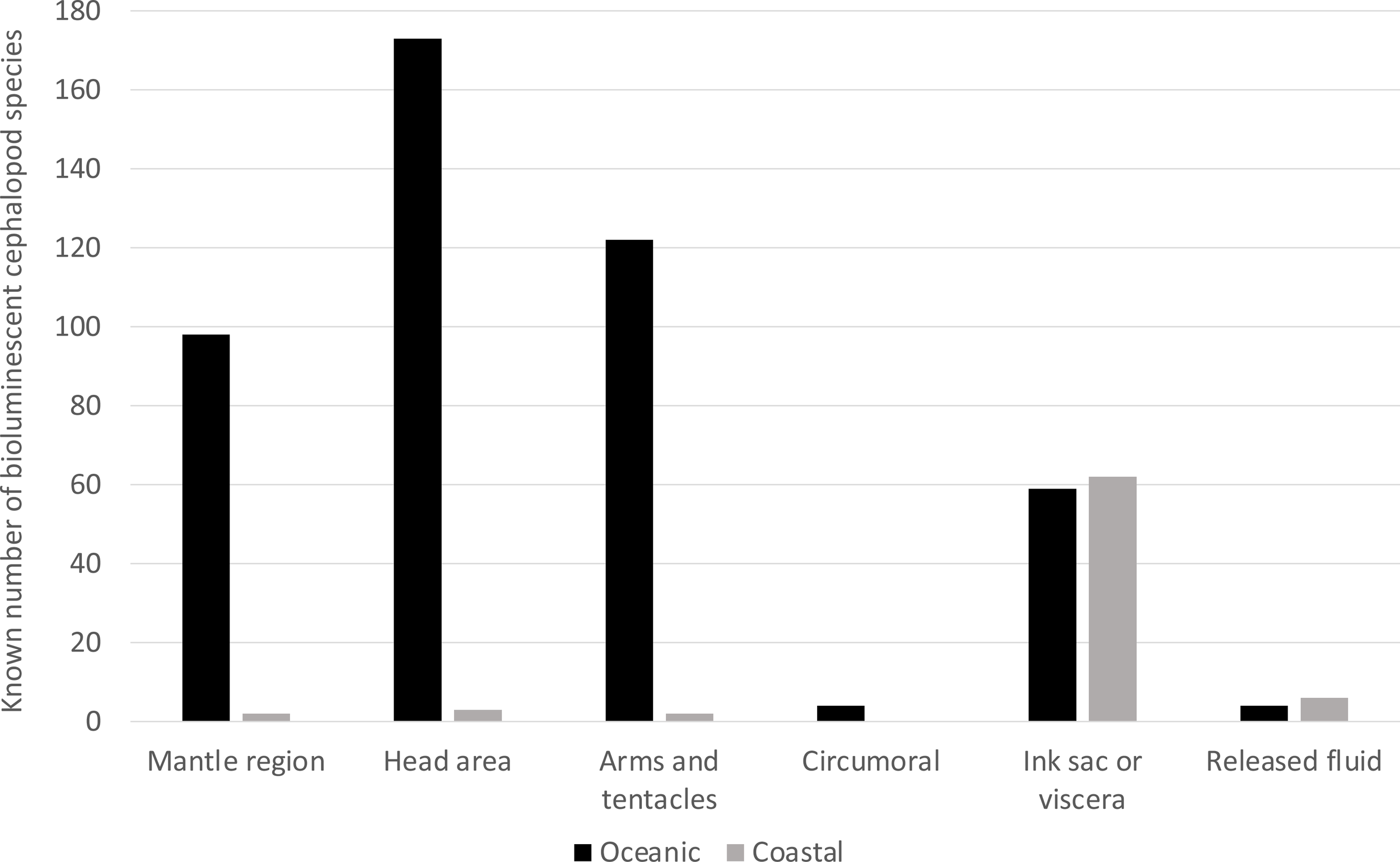 Interestingly, these patterns are maintained when we divide the groups according to light origin (autogenic vs. bacteriogenic photophores). Coastal light-producing cephalopods mainly comprise myopsid and bobtail squids, namely the Loliginidae and Sepiolidae (see also section 4), which have bacteriogenic photophores (Nishiguchi et al., 2004; Guerrero-Ferreira & Nishiguchi, 2009; Lindgren et al., 2012). By contrast, oceanic luminous species usually have autogenic light organs (Lindgren et al., 2012). Similar trends have been observed in fishes, where a higher proportion of bacteriogenic light organs is found in species that live closer to the ocean floor and the coastal areas, compared to oceanic fishes (Morin, 1983; McFall-Ngai and Toller, 1991; Haygood, 1993; Paitio et al., 2016).