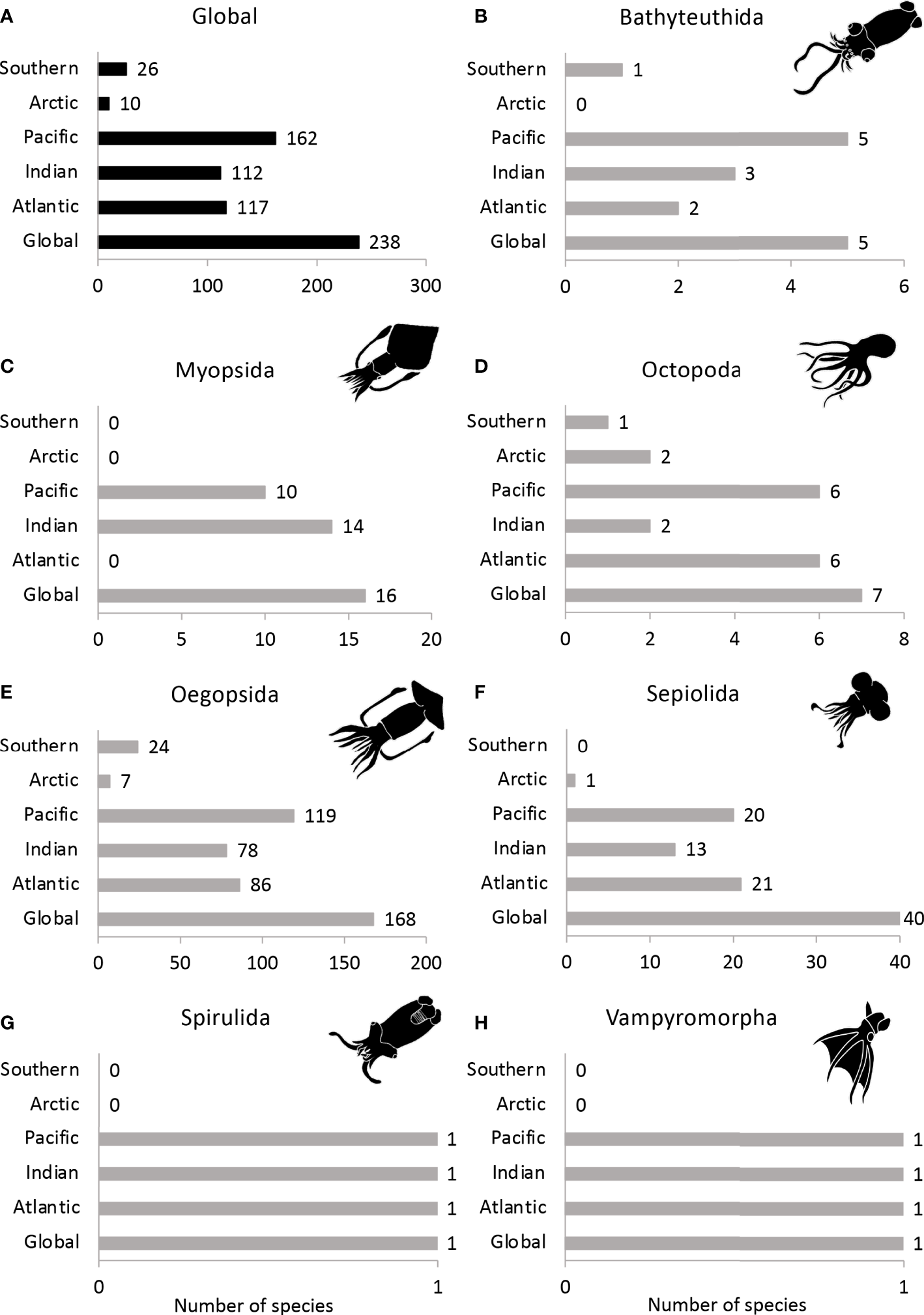 Total known number of bioluminescent cephalopod species for each ocean basin in (A) all cephalopods, (B) Bathyteuthida, (C) Myopsida, (D) Octopoda, (E) Oegopsida, (F) Sepiolida, (G) Spirulida and (H) Vampyromorpha.