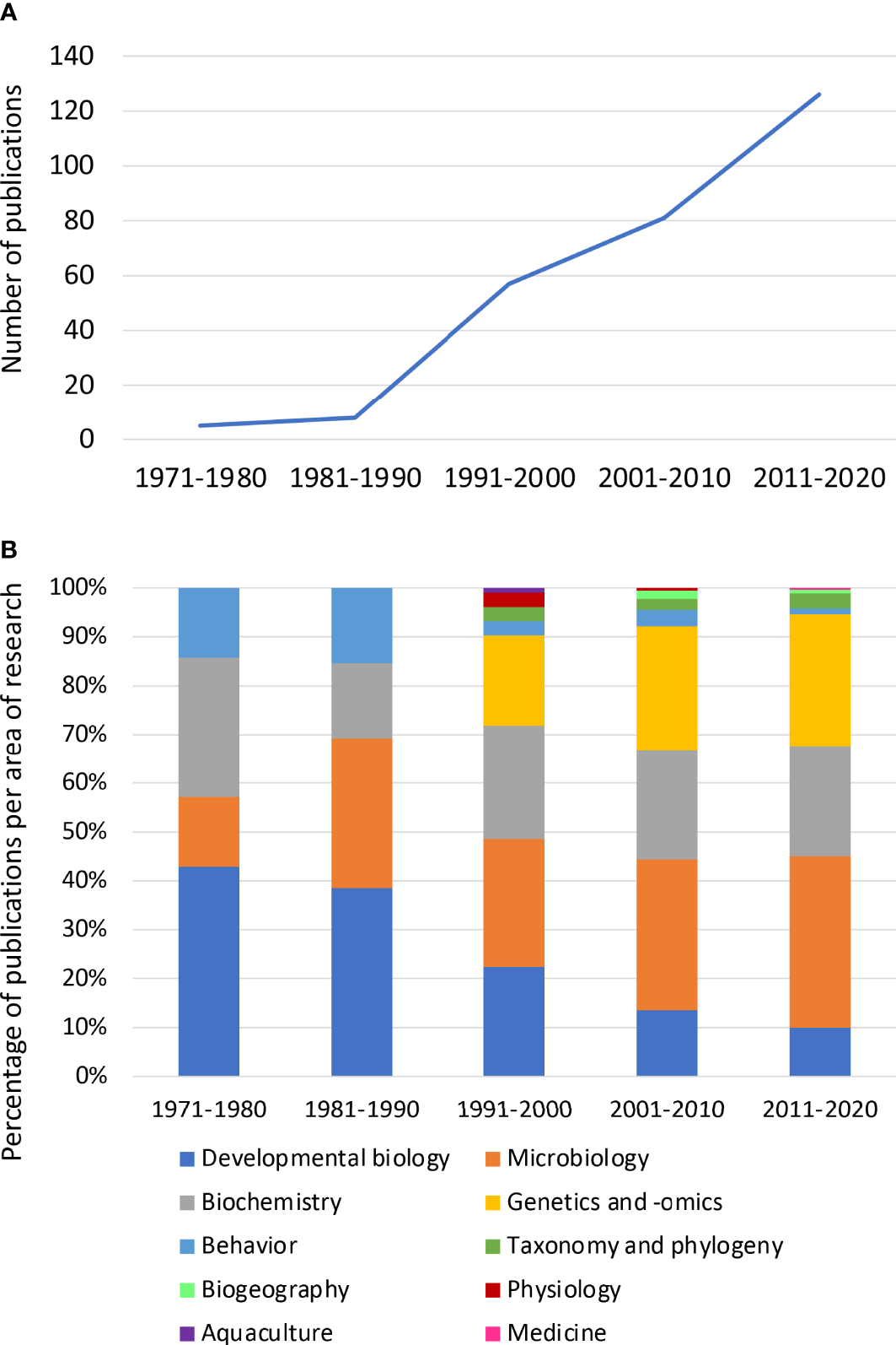 (A) Decadal publication trends (number of publications) on bioluminescence in cephalopods between 1971 and 2020. (B) Percentage of publications on bioluminescence in cephalopod research, between 1971 and 2020, according to the research area.