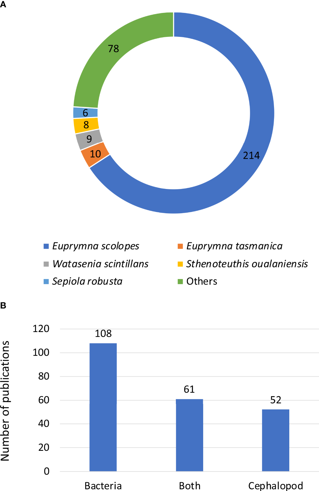 Overall, amongst the 277 studies listed in our analysis, the Hawaiian bobtail squid Euprymna scolopes is the most studied species by far, with 214 publications (77%). Other studied bioluminescent cephalopods include E. tasmanica, Watasenia scintillans, Sthenoteuthis oualanienesis and Sepiola robusta, but each only with 6 to 10 studies (Figure 11A). The category “others” comprises 49 species or groups of species.