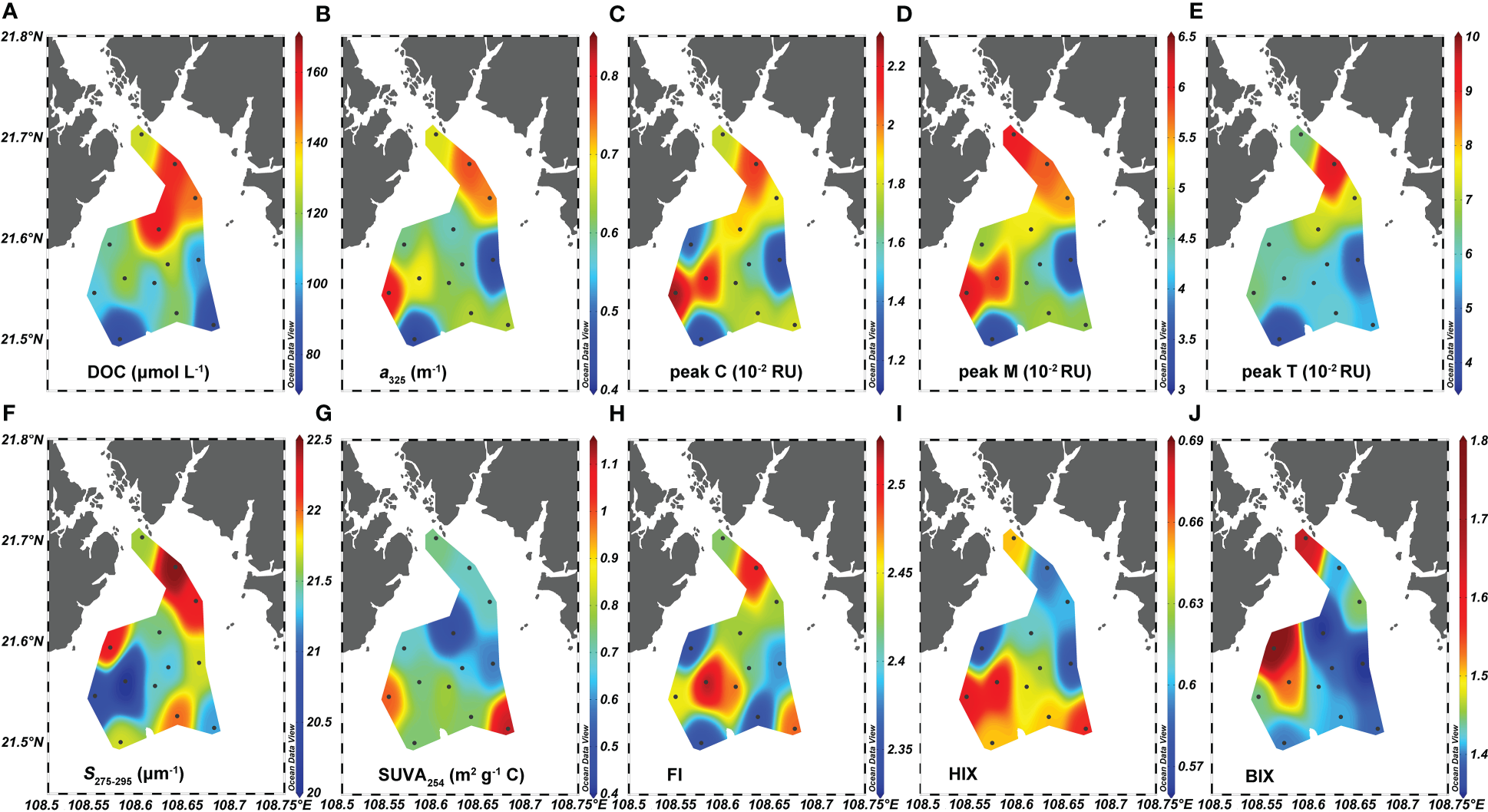 Distributions of (A) dissolved organic carbon (DOC), (B) absorption coefficient at 325 nm (a325), (C) peak C, (D) peak M, (E) peak T, (F) spectral slope (S275-295), (G) specific ultraviolet absorbance at 254 nm (SUVA254), (H) fluorescence index (FI), (I) humification index (HIX), and (J) biological index (BIX) in the surface water of Qinzhou Bay.