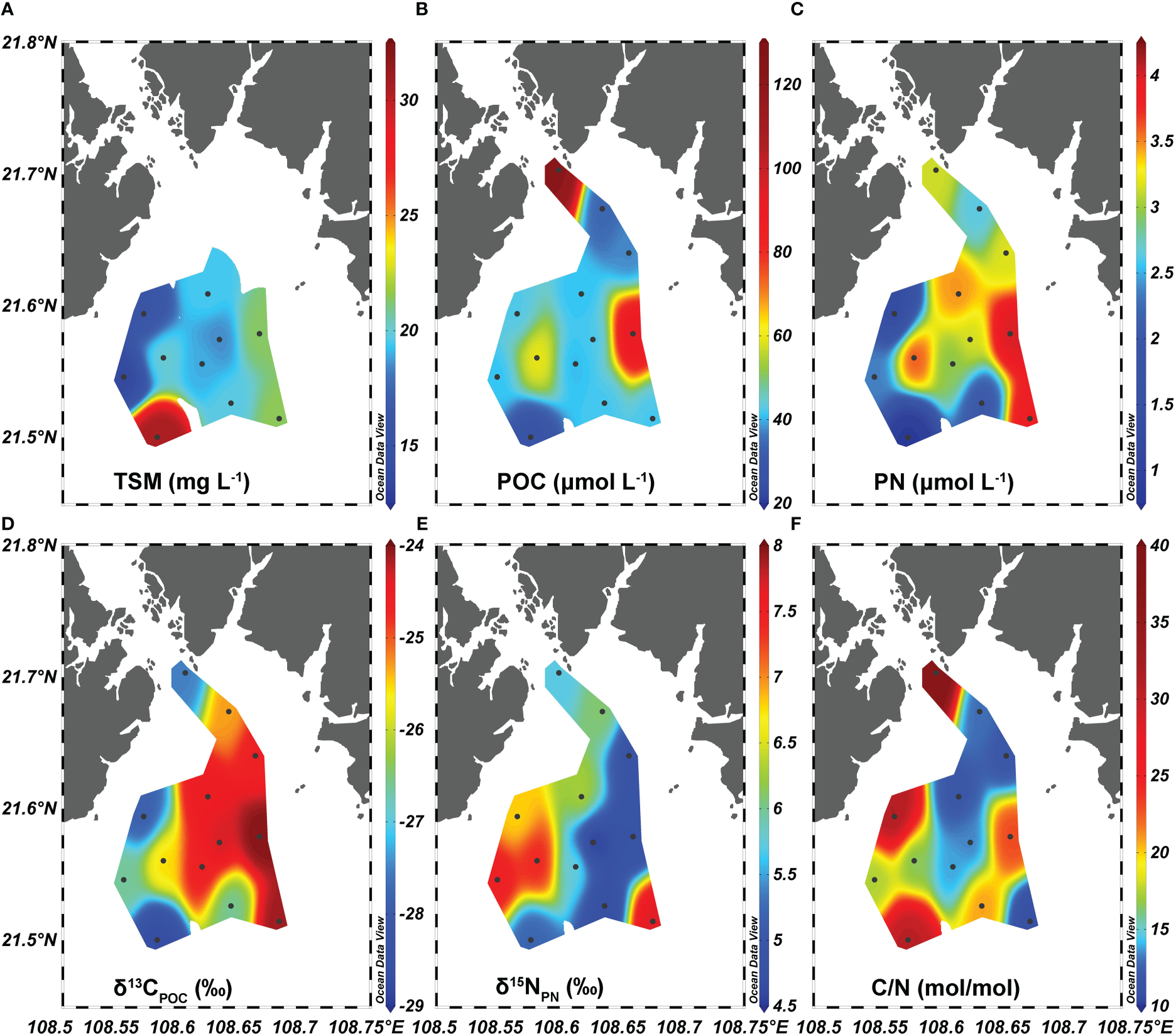 Distributions of (A) total suspended matter (TSM), (B) particulate organic carbon (POC), (C) particulate nitrogen (PN), (D) δ13CPOC, (E) δ15NPN, and (F) C/N ratio in the surface water of Qinzhou Bay.