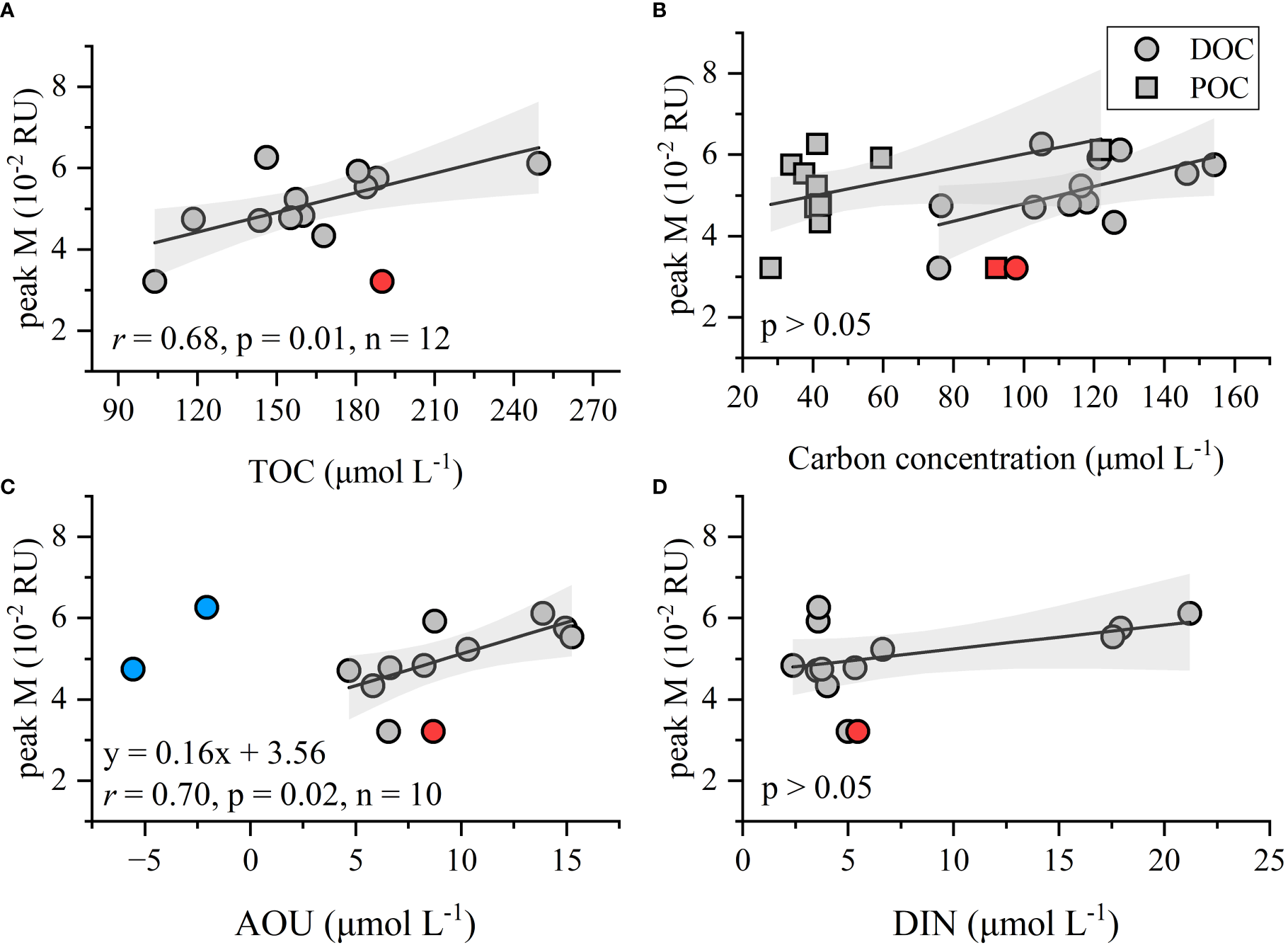 Relationships between the intensity of humic-like peak M versus TOC, DOC, POC, AOU, and DIN. The red point is an abnormal value (outlier) that was excluded from linear fitting. Blue points are the negative AOU values also excluded from linear fitting. Gray shading shows the 95% confidence bands for the fitted regression lines. (A) Relationships between peak M and TOC; (B) Relationships between peak M and DOC; (C) Relationships between peak M and AOU; (D) Relationships between peak M and DIN.