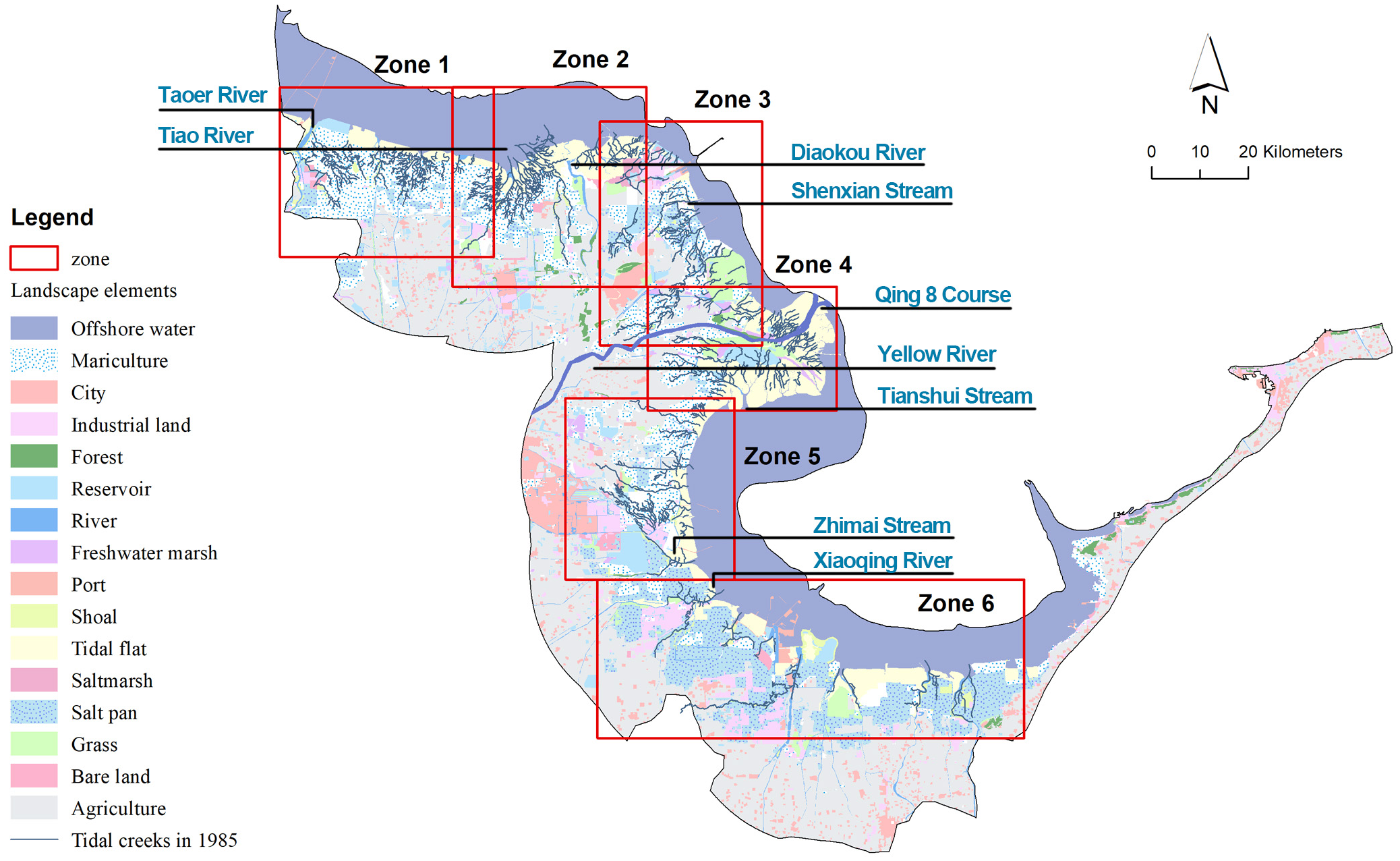 Study area and subzone divisions. The Yellow River Delta study area with landscape elements and tidal creeks in 1985.