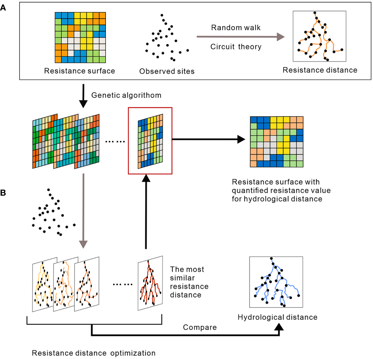 Framework for landscape resistance quantification. (A) Resistance distance calculation; (B) Resistance surface assignment based on observed hydrological distance.