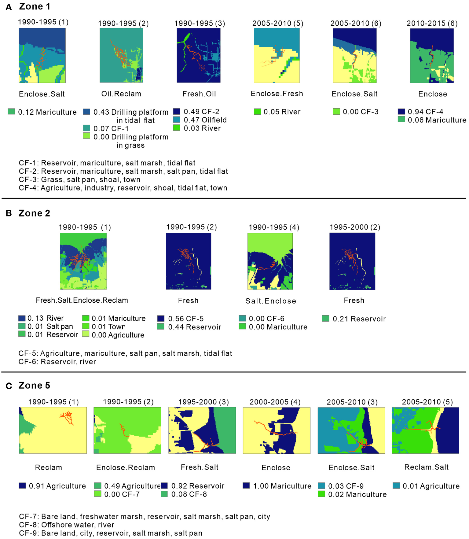 The landscape resistance inversion results of tidal creeks with changes in 5-year intervals that were significantly related to landscape resistance revealed that resistance surfaces and the number of tidal creeks were different in different zones and at different times. Only resistance surfaces containing sea reclamation activity categories (with R2 higher than 0.1) are shown as the leading resistance surface in the rank of all possible resistance surface combinations in each tidal creek (Table 2) (the model result with optimal resistance surfaces composed of only coastal wetland of saltwater, null model, and distance model is not listed in the table). In general, the period of 1990–1995 had the greatest number of tidal creeks influenced by resistance surfaces, followed by the period of 2000–2005. The creek ID in each zone demonstrates that the influence of resistance surfaces at different times can be seen in the same tidal creeks. The majority of resistance surfaces are composite resistance surfaces, with two surfaces of either human activity or natural elements. Based on the specific resistance surfaces identified in Table 2, we discovered that sea enclosure activity played a significant role in the formation of resistance surfaces in the majority of zones, as such activities were present in the majority of resistance surfaces in zones 1, 3, 4, 5, and 6. Freshwater resource facilities are the second surface resistance component since these facilities were involved in the majority of zone 2 and 6 resistance surfaces. Engineering in oil fields also contributed to zone 4 resistance surfaces.