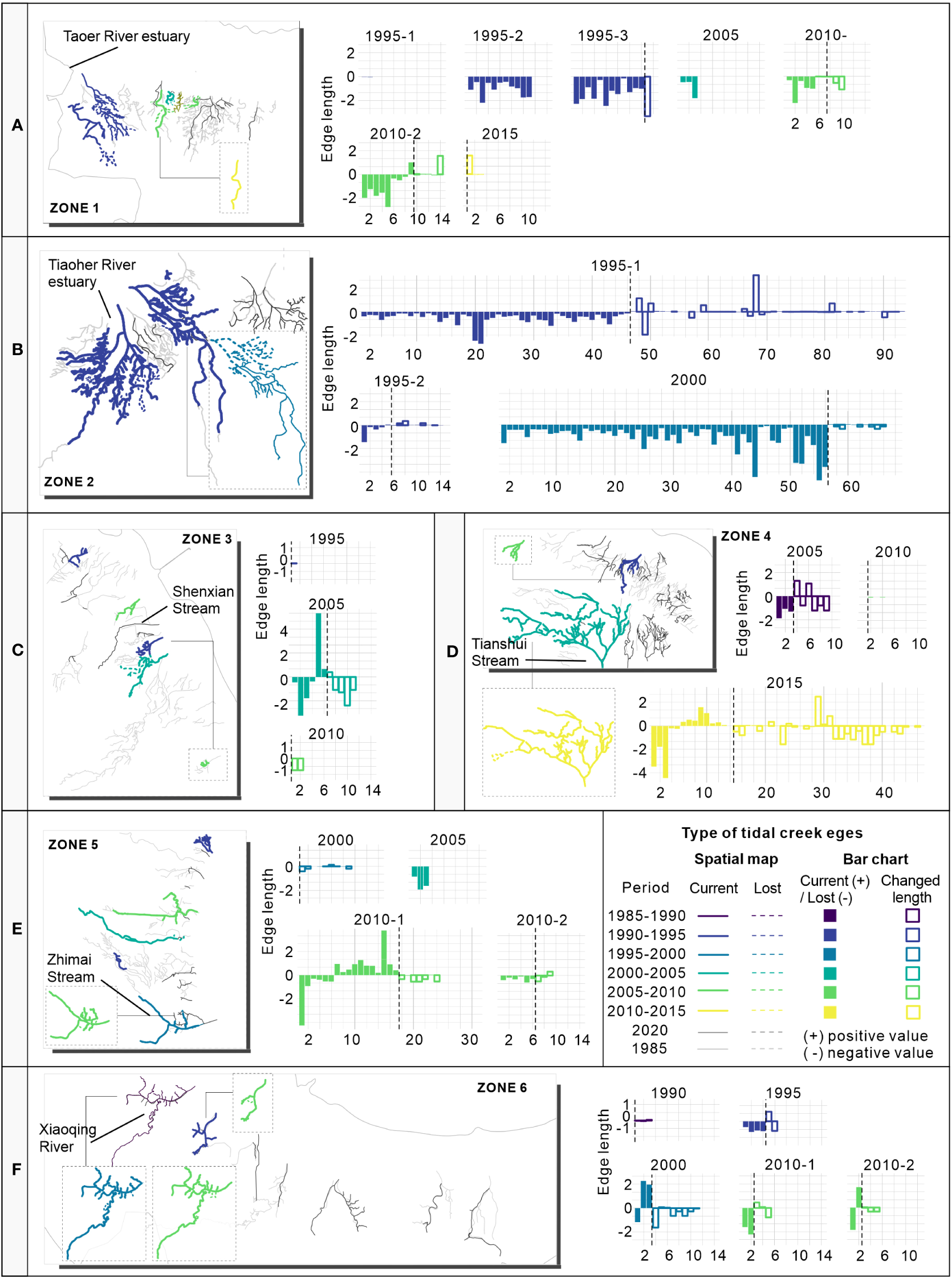 Spatial distribution of influenced tidal creeks in zone 1(A), zone 2(B), zone 3(C), zone 4(D), zone 5(E), and zone 6(F). Bar graphs of the edge length changes of the tidal creeks. The numbers in parentheses distinguish different tidal creeks of the same period.