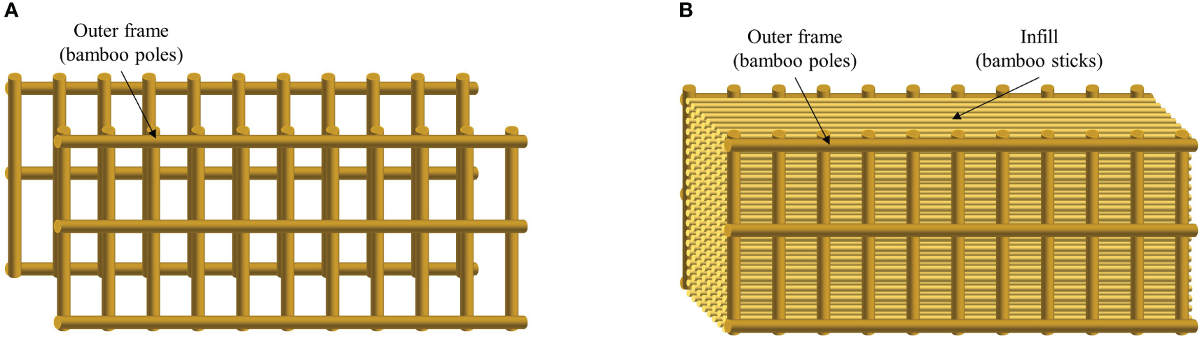 Schematic of bamboo fence (A) and staggered arrangement of infill (B).