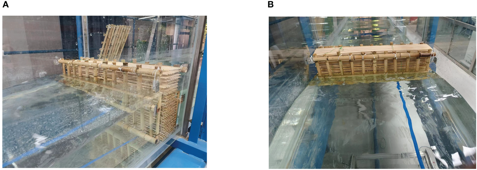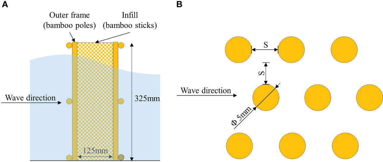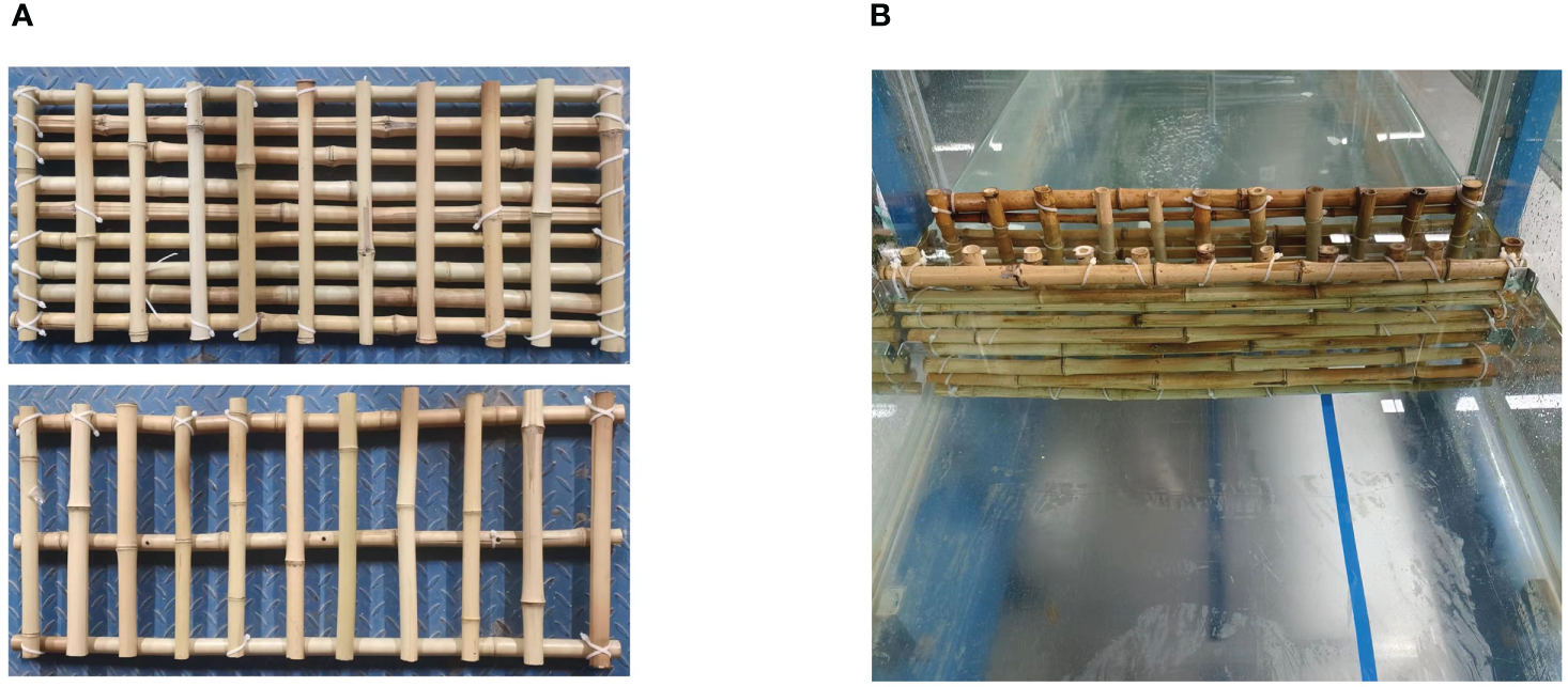 The mimicked prototype configuration was determined based on the practices of Albers et al. (2013) and Thieu Quang and Mai Trong (2020) in the field, where the height of the fence was 1.3 m, the diameter of the bamboo poles was approximately 8 cm, and the diameter of the infill bamboo sticks ranged from 1 to 2 cm. The length scale of the experiment was set to be 1:4; therefore, the physical model used in the experiment has a height of 32.5 cm, an internal width of 12.5 cm, a diameter of approximately 2 cm for the outer bamboo poles (Figure 4A), and a diameter of 0.5 cm for the infill bamboo sticks (Figure 4B). Each fence model had a distinct frame density and infill porosity. The fence model used in the experiment and the characteristics of the infill and frame are discussed in Table 1.