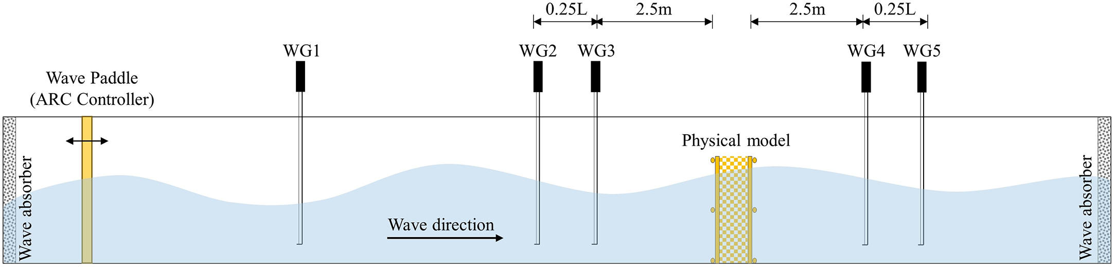 The wave flume used is located in the State Key Laboratory of Water Environment Simulation at Beijing Normal University, which is 25 m in length and 0.8 m in width. This flume can generate regular or irregular waves with a minimum operating water depth of 0.2 m and a maximum wave height of 0.3 m. There are five digital wave gauges (WG1 → WG5) that can directly generate a digital signal of water level at a maximum sampling frequency of 1,000 Hz and an accuracy of 5‰; the placement of each wave gauge is shown in Figure 5. WG1 is used to control the non-reflected wave maker with an active reflection compensation (ARC) system, and it is located at the front of the tank near the wave paddle. A group of WG2 and WG3 at the front of the model are used to measure the height Hr of the reflected wave; the incoming and reflected waves can be separated by using the method of Goda and Suzuki (1976). Another group of WG4 and WG5 at the rear of the model are placed to monitor the transmitted wave height Ht at the same time.