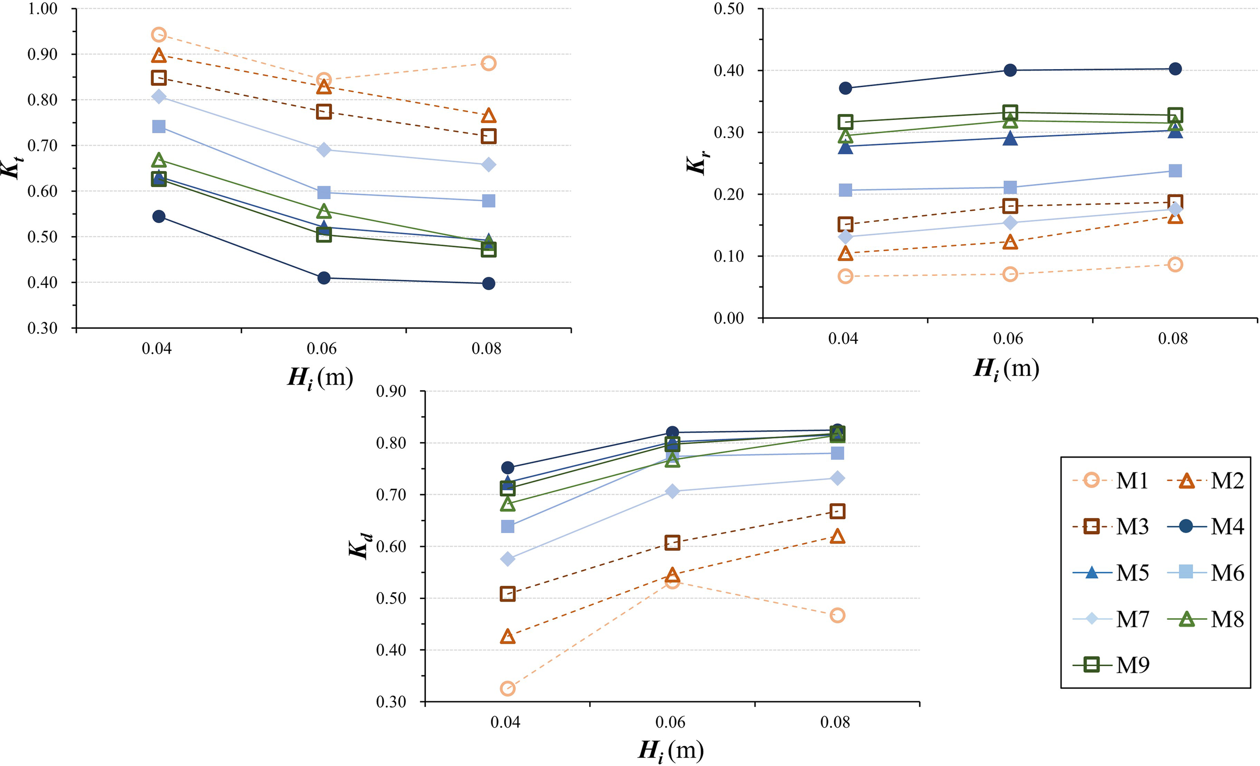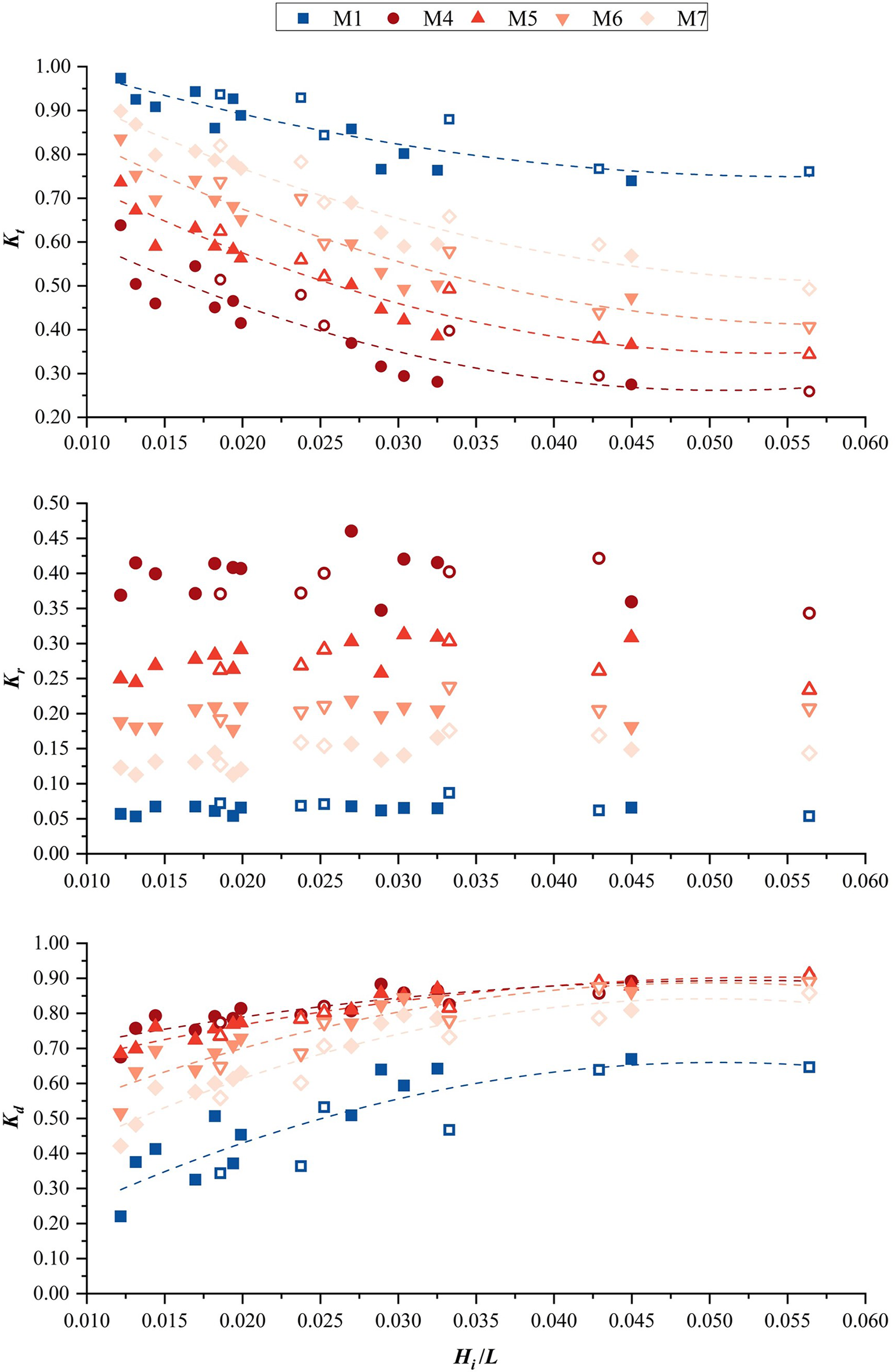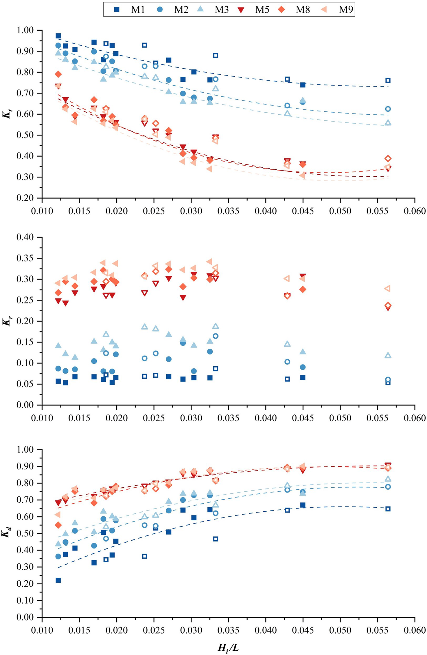 It is apparent that the ability of fences to reduce wave energy is influenced by the porous infill (see Figure 6; the hollow symbols represent the wave overtopping), with the transmission coefficient of the fences with porous infill being less than that of fences without infills. For the group without infill, the transmission coefficients of M2 and M3 are lower than those of M1. In the second group with the presence of infill, the transmission coefficients were 0.36–0.79 for M8 and 0.31–0.73 for M9. The differences between the transmission coefficients of fences are invariably small, which indicates that the transmission coefficient is not significantly affected by the density of the frame used in the presence of infill, regardless of whether it is a front or rear frame. Also, for the transmission coefficient, the group of fences without infill experiences a smaller change than the group of fences with porous infill. Moreover, all fence transmission coefficients descend as wave steepness ascends, and this behavior is evident whether wave overtopping occurs or not.