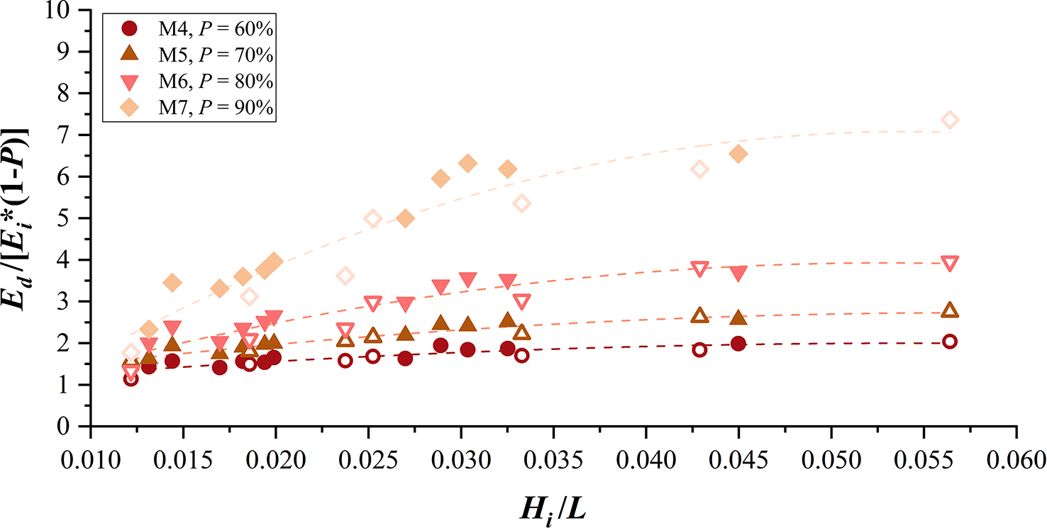 Moreover, the presence of infill improves wave-energy dissipation within the bamboo fence, with the underlying mechanism being the same as that of wave transmission through the vegetation field, where the wave received surface friction, drag, and inertial forces in the rigid cylinders and additionally received vertical drag forces when the cylinders were horizontally aligned. For the infill made of bamboo sticks, the wave-height decline was more pronounced in the first few rows of the cylinders, and the infill porosity decrease will directly enlarge the frontal area of the infill in the first place. The reduced spacing between the front row of bamboo sticks produces a stronger flow blockage, which means that the wave reflection and drag force generated by the first row of sticks will be strengthened (Etminan et al., 2019). Because less wave energy was introduced into the cylinders, the performance of the cylinders to dissipate wave energy will therefore be somewhat strengthened (Suzuki et al., 2019). The bamboo sticks used in the infill are spaced at a short distance, and the sticks in the subsequent rows are located in the wake of the front row, which is subject to a strong sheltering effect, and the flow velocity they face decreases and the drag force generated decreases (Gijon Mancheno et al., 2021). Therefore, although reducing the infill porosity will increase the energy dissipation, this increment is quite limited, especially at lower infill porosities, which in turn reduces the wave dissipation effect induced by a single cylinder. Using the ratio of Ed/Ei and (1 − P) to represent the wave-energy dissipation effect produced by a single cylinder of the infill, the result shown in Figure 8 suggests that the infill with the highest porosity has the greatest dissipation efficiency induced by a single cylinder and the difference between the dissipation effects produced by a single cylinder of each infill is greater with shorter waves.