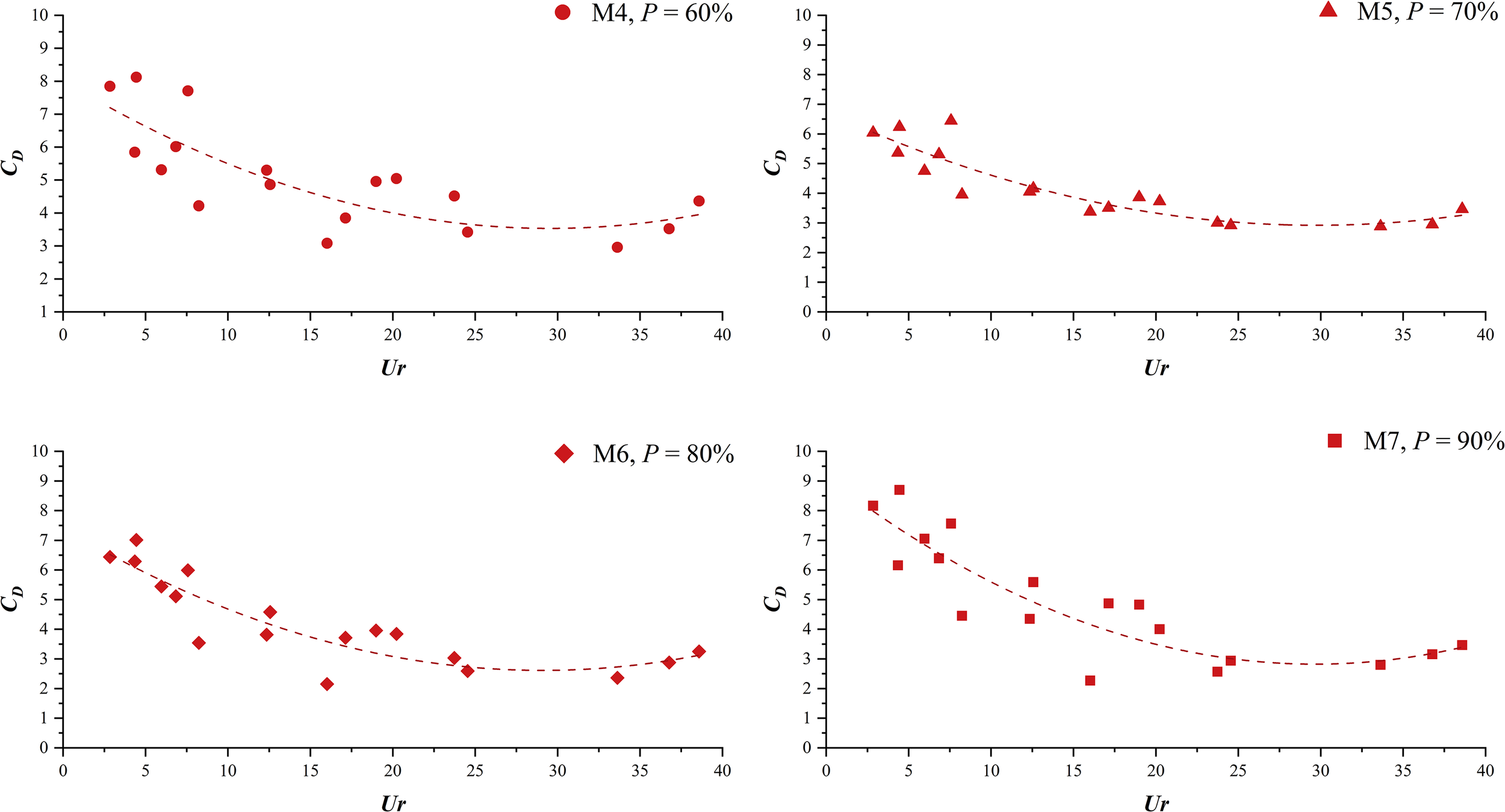 Figure 9 shows the calculated results of bulk drag coefficients for the fences with porous infill using Equation 6. Since the wave transmission model ignores the presence of the external frame, which has some geometrical irregularity and impact on the wave attenuation, the calculation results are not fitted well with the Ursell number (Ur), which indicates the non-linearity of the wave. However, when the wave non-linearity increases, the bulk drag coefficients of all four fences decrease, with the bulk drag coefficient of M4, which has the highest density of infill, at 3.0–8.1; M5, 2.9–6.4; M6, 2.2–7.0; and M7, 2.2–8.7. When comparing the four fences under the same wave conditions, it is worth noting that the calculated bulk drag force coefficients for fences M4 and M7 are nearly close, while the calculated results for M5 and M6 are also very similar but smaller than the bulk drag coefficients of fences M4 and M7.