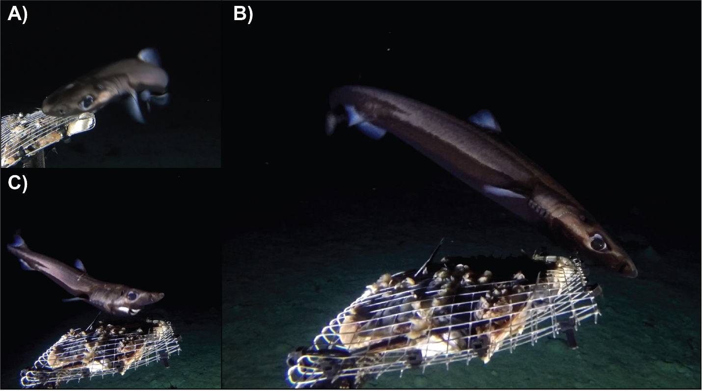 In-situ images of Etmopterus bigelowi from deep waters of the Cayman Islands collected using deep-sea video landers (Phillips et al., 2019). One male individual was observed on July 26th 2022 (A) followed by observations of a male (B) and female (C) on September 19th 2022. The individuals made several passes across the field of view and were observed interacting with the bait cage.