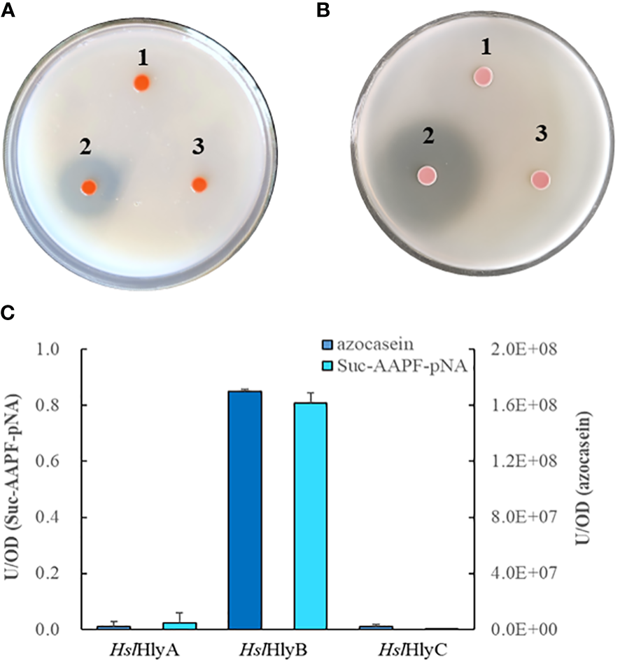 Protein hydrolysis by recombinant Hfx. volcanii cells. Hydrolysis of skim milk (A) and gelatin (B) on YPC agar plates, azocasein and Suc-AAPF-pNA hydrolytic activity (C) of cell-free culture supernatants of recombinant Hfx. volcanii. 1, HslHlyA; 2, HslHlyB; 3, HslHlyC.
